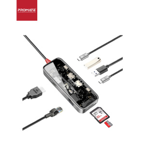 Концентратор Promate USB-C 8-in-1 USB-C PD100W + HDMI 4K60Hz + USBC + 2xUSB 3.0 + RJ45 1000Mbps + SD/MicroSD grey (transhub-mini)