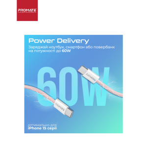Кабель Promate EcoLine-CC200 USB Type-C - USB Type-C (M/M), 3 A, 60 W, 2 м, Pink