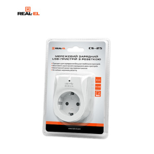 Мережевий зарядний пристрій з розеткою REAL-EL CS-25 (2USB, 2.1A) White