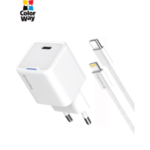 Мережевий зарядний пристрій ColorWay GaN Mini 20W PD Port PPS USB-C White (CW-CHS059PD-WT) + кабель Lightning