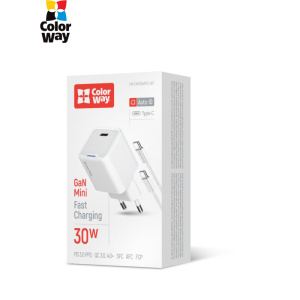 Мережевий зарядний пристрій ColorWay GaN Mini 30W PD Port PPS USB-C White (CW-CHS054PDC-WT) + кабель USB Type-C