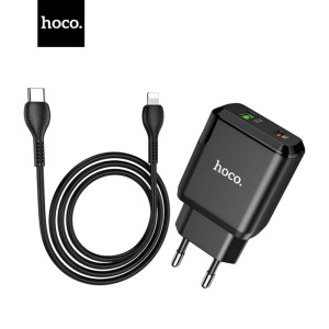 Мережевий зарядний пристрій Hoco N5 (1USB 3A QC3.0 + 1 PD Type-C) Black (S25719) + кабель Lightning
