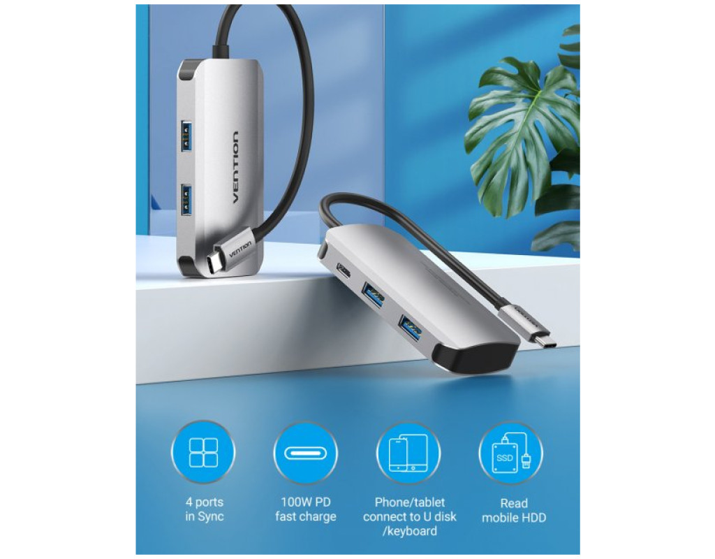 Мультифункціональний хаб Vention з роз'ємом USB Type-C дає змогу збільшити кількість роз'ємів на вашому пристрої. |