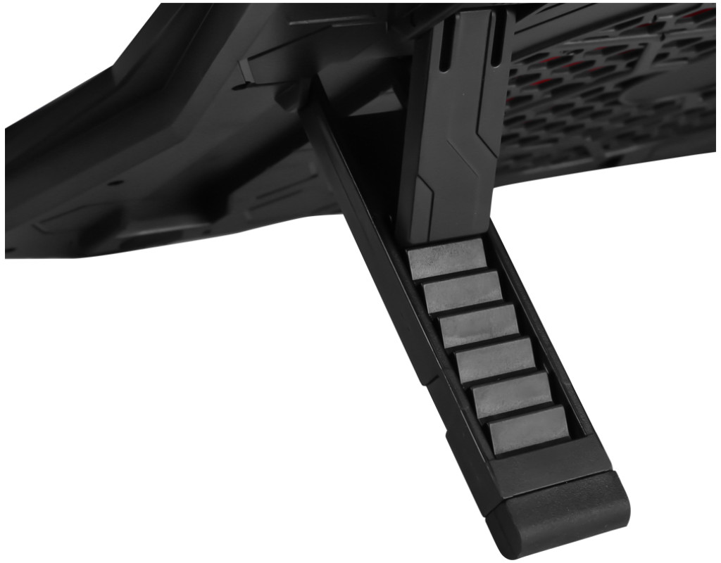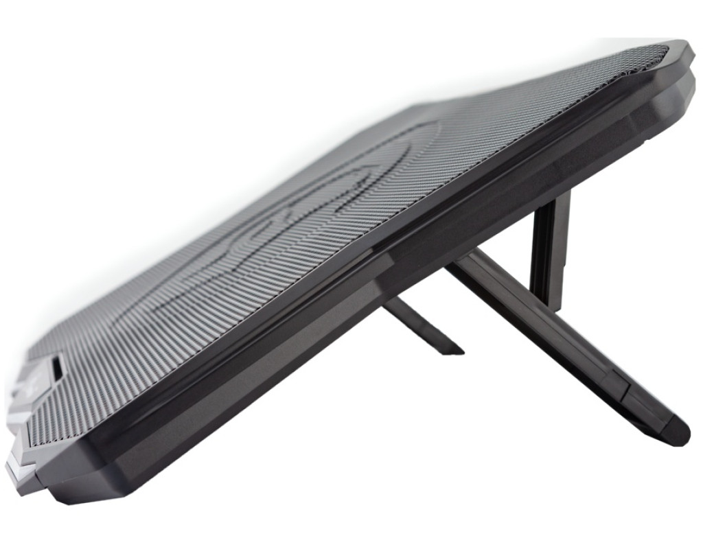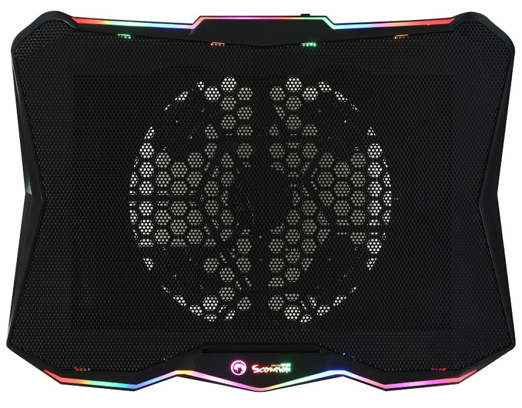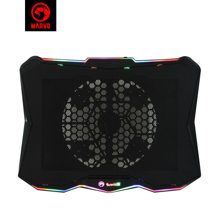 Охолоджувальна підставка з підсвічуванням Marvo FN-40. Буде корисною під час роботи ноутбука під високим навантаженням. Вона забезпечує потужне охолодження і зменшує ризик перегріву, що дозволить ноутбуку працювати на повній потужності, і позитивно позначиться на довговічності його компонентів. RGB підсвічування додає сучасний вигляд. FN-40 має високий кут нахилу що регулюється для комфорту використання. Охолодження здійснюється одним великим 180-міліметровим вентилятором. Сітчасті вентиляційні отвори відмінно справляються з розподілом тепла по всій поверхні, забезпечуючи більш ефективне охолодження і відведення тепла. Особливості