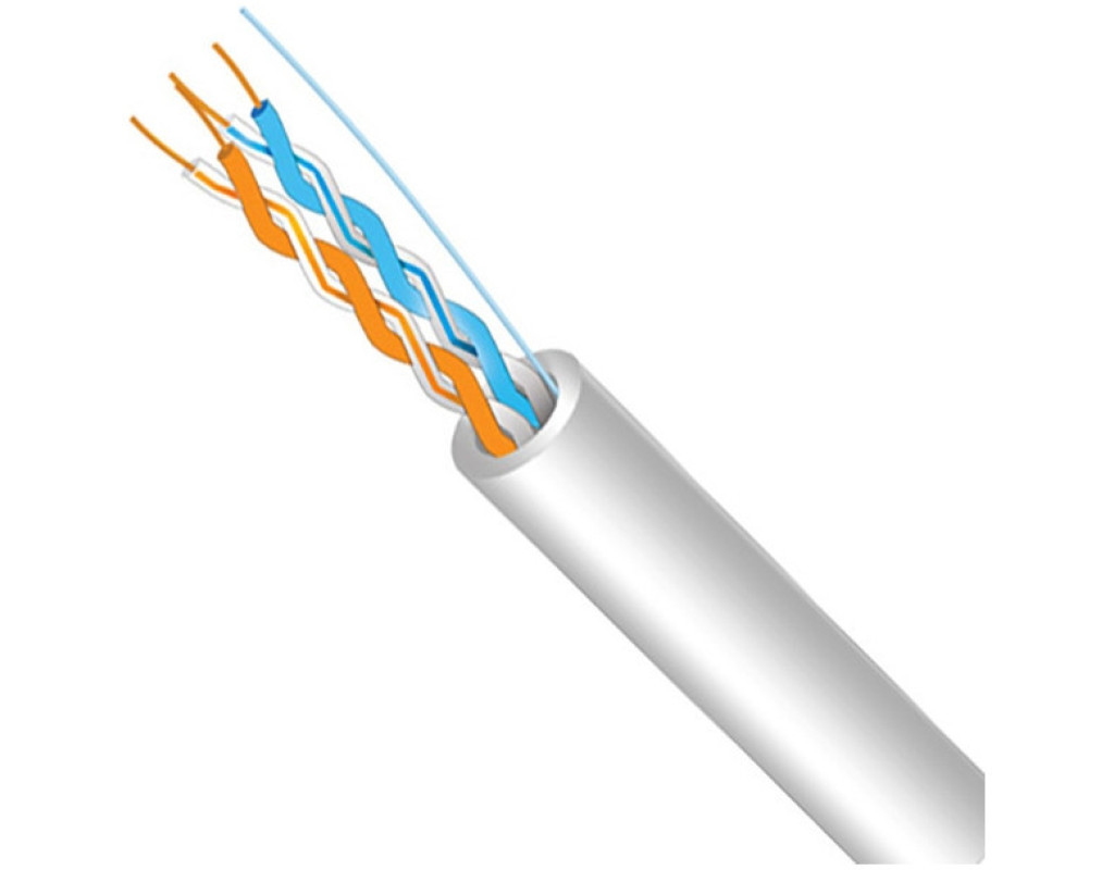 Область застосування: Двопарний UTP кабель FinMark категорії 5 призначений для застосування в локальних мережах передавання даних: PBX, V.11, X.21, ISDN, Ethernet (10Base-T), ATM-25/52/155 Мбіт/с, 100VG-AnyLAN, Fast Ethernet (100BASE-TX), Token Ring 16/100 Мбіт/с, Firewire 100 Мбіт/с. Умови експлуатації: Призначений для стаціонарної прокладки всередині будівель, станцій, споруд, апаратури. Повністю мідні провідні жили 24AWG забезпечують надійну роботу ліній на максимальних відстанях. Конструкція: Оболонка кабелю виконана з полівінілхлоридного пластикату (PVC) білого кольору. Кабель складається з 2-х пар провідників, звитих між собою. У кабелі застосована загальноприйнята колірна ідентифікація провідників: