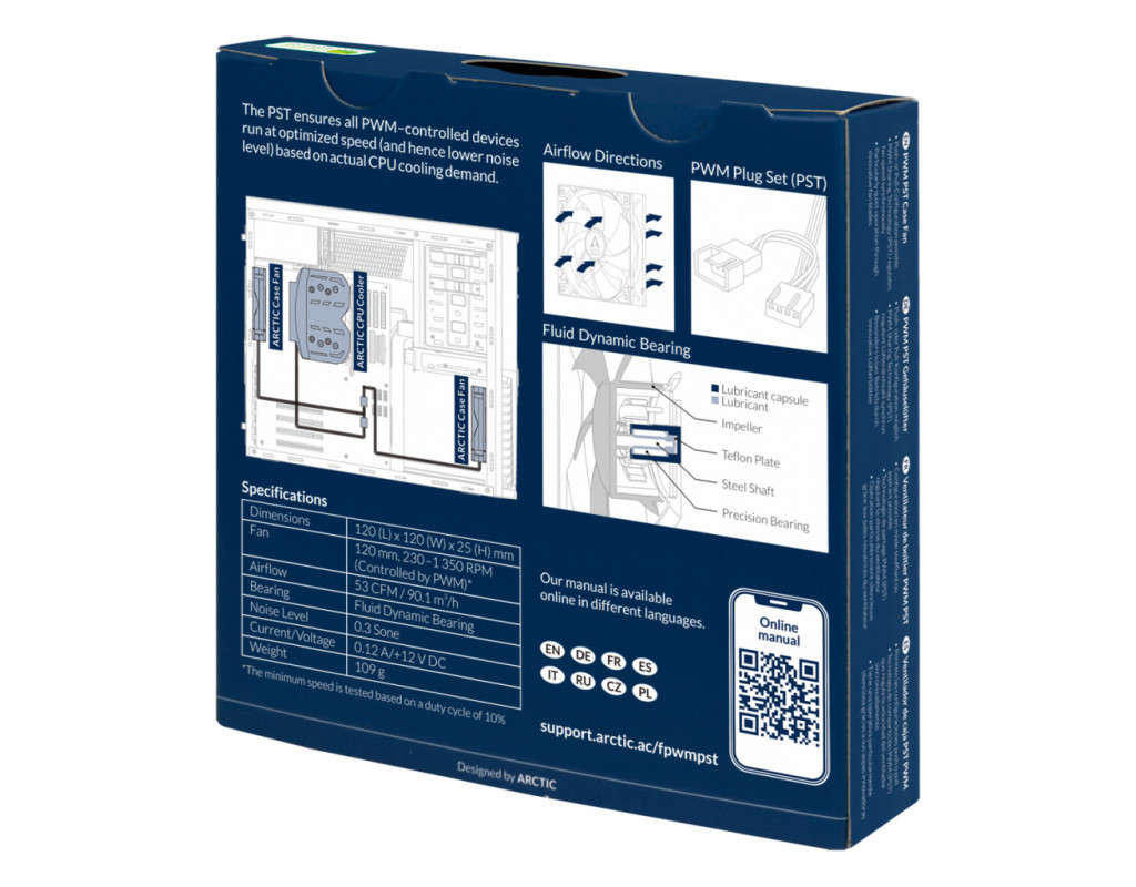 Arctic F12 PWM PST — 120-міліметровий вентилятор для корпуса, призначений для охолодження компонентів ПК. Працює зі швидкістю 230-1350 обертів за хвилину, забезпечуючи активний повітряний потік. Модель має інноваційний дизайн лопатей, який покращує потік повітря та сприяє високоефективній вентиляції. Виріб оснащений гідродинамічним підшипником із масляною капсулою, яка запобігає витоку мастила. Таким чином, цей підшипник працює так само тихо, як підшипник ковзання, але має значно вищий термін служби. |