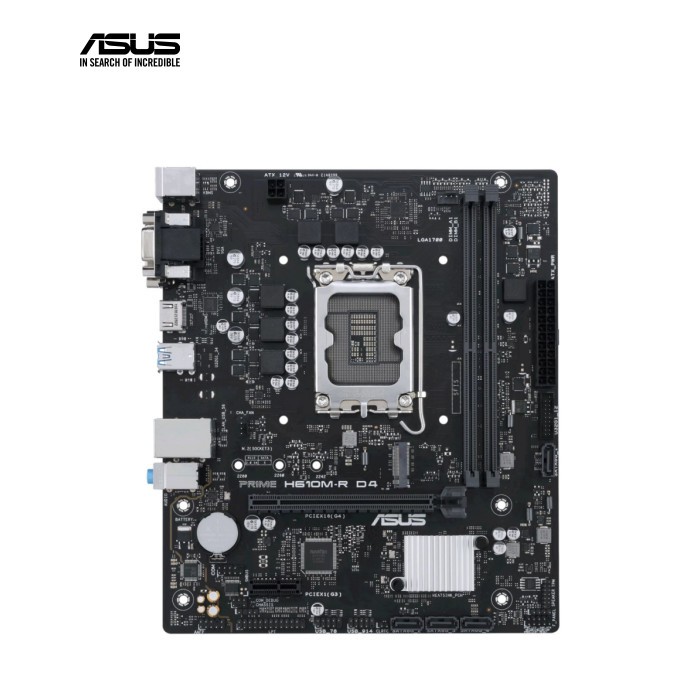 Asus Prime H610M-R D4-SI — компактна материнська плата, розроблена для процесорів з роз'ємом Socket 1700. Вона має високу якість та надійні характеристики, що роблять її ідеальним вибором для збірки комп'ютера. Завдяки своїм характеристикам і підтримці сучасних технологій вона готова впоратися з різноманітними завданнями, включаючи ігри, мультимедіа і роботу з програмами. Ця материнська плата має формфактор Micro ATX, що дозволяє легко встановлювати її в компактний корпус. Вона підтримує два слоти пам'яті DDR4, які забезпечують швидку та ефективну роботу системи. Вона також оснащена роз'ємами VGA, DVI та HDMI, що дозволяють підключати різноманітні пристрої відеовиходу. Asus Prime H610M-R D4-SI також має два роз'єми PS/2 для підключення клавіатури та миші, а також один роз'єм LAN для швидкого й надійного підключення до локальної мережі. Комплексне охолодження забезпечує радіатор PCH та утиліта Fan Xpert 4. Всебічний захист системи гарантує фірмове рішення 5X Protection III. Особливості: