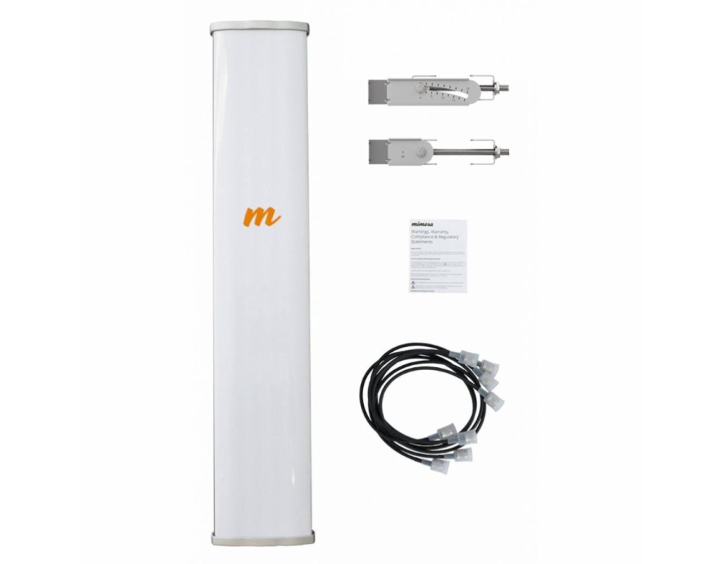 Mimosa N5-45x4 (100-00084) - високопродуктивна секторная антена з коефіцієнтом посилення 22 dBi, що демонструє високі характеристики рупора по співвідношенню випромінювання фронт/тил і придушення рівня бічних пелюсток. Антена призначена для різних варіантів підключень з многоточечним доступом.N5-45x4 здатна забезпечити посилення сигналу з охопленням ширини променя в 42 градуси на рівні половинної потужності практично без бічних випромінювань. Для досягнення найкращого рівня придушення шуму і відносини випромінювання 43 дБ (фронт/тил) в конструкції антени застосовані металізовані торцеві кришки і високоточна пресована задня пластіна.Достігая рівня з найбільшою дальністю покриття і кількістю абонентів, що підключаються серед всіх рішень Mimosa PTMP, вісім пристроїв A5c і вісім антен Mimosa N5-45x4 для зони охоплення в 360 градусів можуть представляти великі можливості для бездротового доступу з використанням технології повторного використання частот і швидкості до 4 Гбіт/с. |