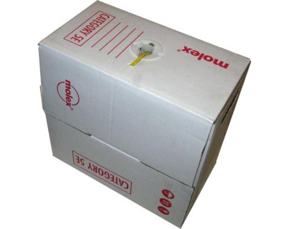 | Мережний Кабель Molex UTP 305м (39-504-5E) - незахищена вита пара (unshielded twisted pair), без захисного екрану навколо окремої пари. Існує декілька категорій кабелю вита пара, які нумеруються від CAT1 до CAT7 і визначають ефективний частотний діапазон, що пропускається. Кабель вищої категорії зазвичай містить більше пар дротів і кожна пара має більше витків на одиницю довжини. Даний кабель відноситься до категорії 5, що означає, що це 4-парний кабель із смугою частот 100 Мгц який використовується для побудови локальних мереж та для прокладення телефонних ліній, а також підтримує швидкість передачі даних до 100 Мбіт/з при використанні 2 пар. |