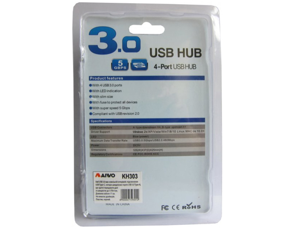 USB-хаб Maiwo KH303 розширює можливості під'єднання вашого сучасного ноутбука або комп'ютера в тих випадках, коли на ньому бракує USB-портів для периферійних пристроїв або вони розташовані незручно, а також у тому разі, якщо ви не хочете розхитувати порт USB Type-C на вашому ноутбуці. Сам USB-хаб KH303 під'єднується до ноутбука через порт USB 3.1 Type-С зі швидкістю передавання даних до 5 Гбіт/сек. Хаб KH303 дає можливість одночасного приєднання до 4 пристроїв із різними інтерфейсами: USB3.1 Gen1 тип А (=USB3.0 Type-A)/USB2.0/USB1.1, розширюючи робоче місце та приватний простір. Він є ідеальним вибором для приєднання пристроїв зовнішнього зберігання даних, USB-флешок, зовнішніх жорстких дисків, клавіатури, миші, цифрової або відеокамери спостереження, мережевих пристроїв, багатоканальних аудіопристроїв, а також будь-яких інших пристроїв USB до вашого ноутбука з зовнішнім портом під'єднання USB Type-C. Інтерфейс приєднання USB-хаба до ноутбука: USB 3.1 Type-C. Порти для приєднання периферійних пристроїв: 4 порти USB 3.0 Type-A (=USB 3.1 Gen1). Функція "швидкої заміни" дає змогу приєднувати/вимикати пристрої без вимкнення системи. Хаб має вбудований кабель завдовжки 29 см (він не від'єднується від хаба). Блок живлення до комплектації не входить. Не вимагає встановлення драйверів. На корпусі адаптера є блакитна смуга — LED-індикатор роботи. Підтримка ОС: Windows 7 / 8 / 8.1 / 10 / Vista / XP, Mac OS X v.10.8 і вище. Матеріал — пластик, колір — чорний блискучий, має вигляд як лакована поверхня. Розмір USB-хаба — 104 х 38 х 24 мм. |