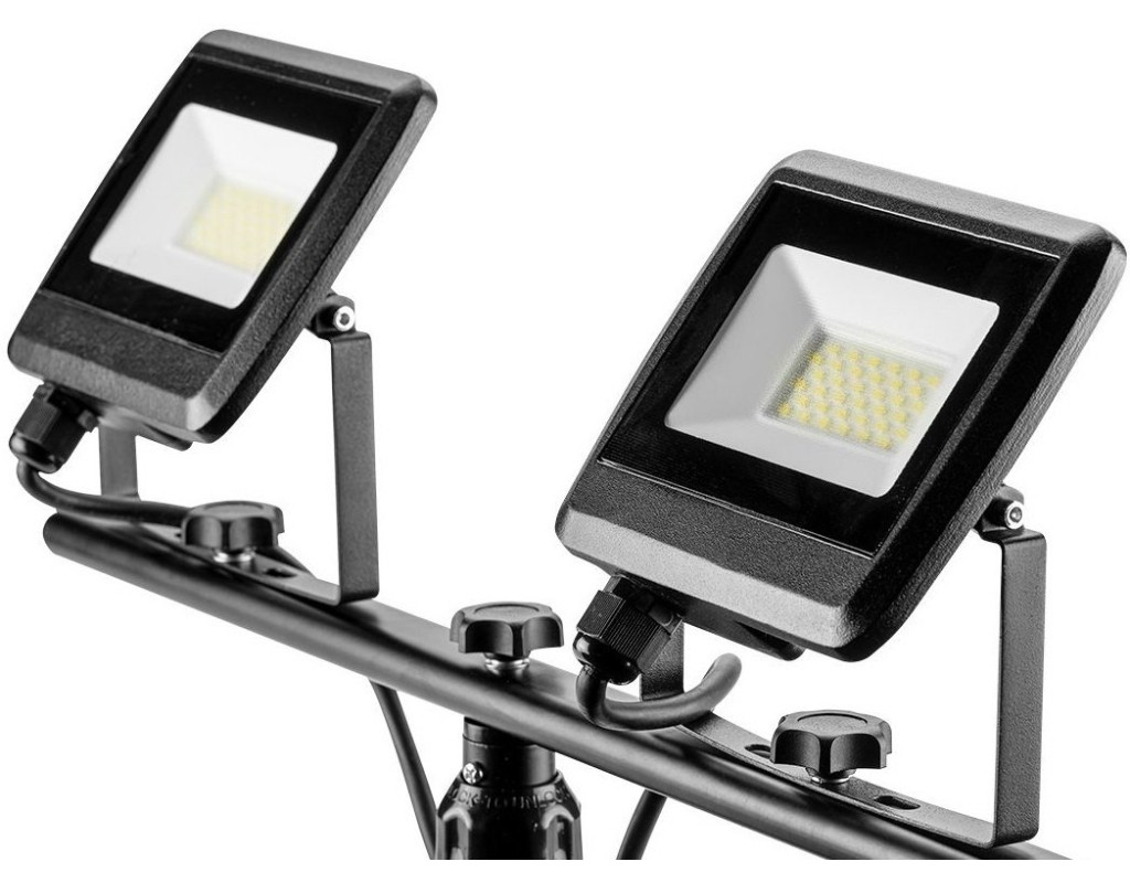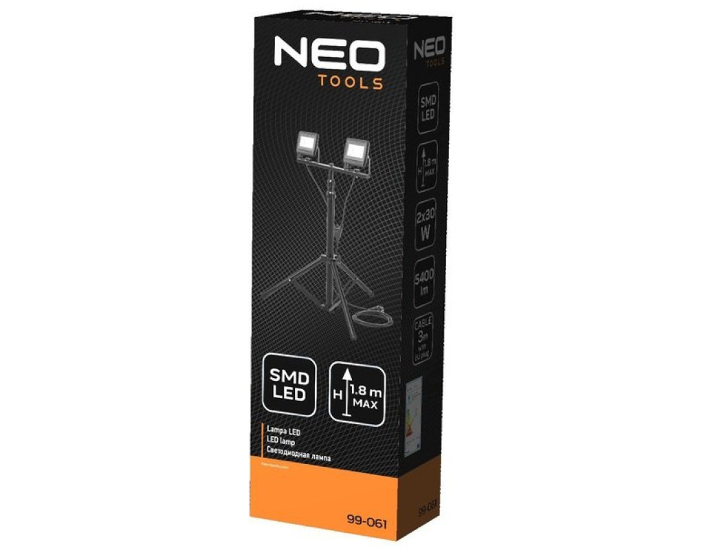 | Прожектор Neo Tools, алюміній, 220 В, 2х30Вт, 5400 люмен, SMD LED, кабель 3 м з вилкою, IP65, на штативі 1.8 м. Рефлектор подвійний на штативі SMD NEO, використовується для внутрішнього та зовнішнього освітлення. Складається із двох ламп, кожна потужністю 30 Вт. Насамперед для використання під час ремонтних та будівельних робіт, коли важлива хороша видимість та відсутні інші джерела світла. Також знадобиться у майстерні, фотостудії, на горищі або у підвалі. Рефлектор може бути корисний зовні для освітлення проїздів, терас або входу в будинок. Що важливо, рефлектор розміщується на телескопічній тринозі. Максимальна висота штатива 180 см. Кут світлового променя досягає 120°. Ви можете встановити напрямок освітлення. Пристрій має міцну конструкцію, оскільки світлодіодний діод поміщений у алюмінієвий плафон за склом. Ступінь захисту корпусу IP65 означає, що він пило-і водонепроникний. Рефлектор має шнур завдовжки 3 метри з вилкою. |