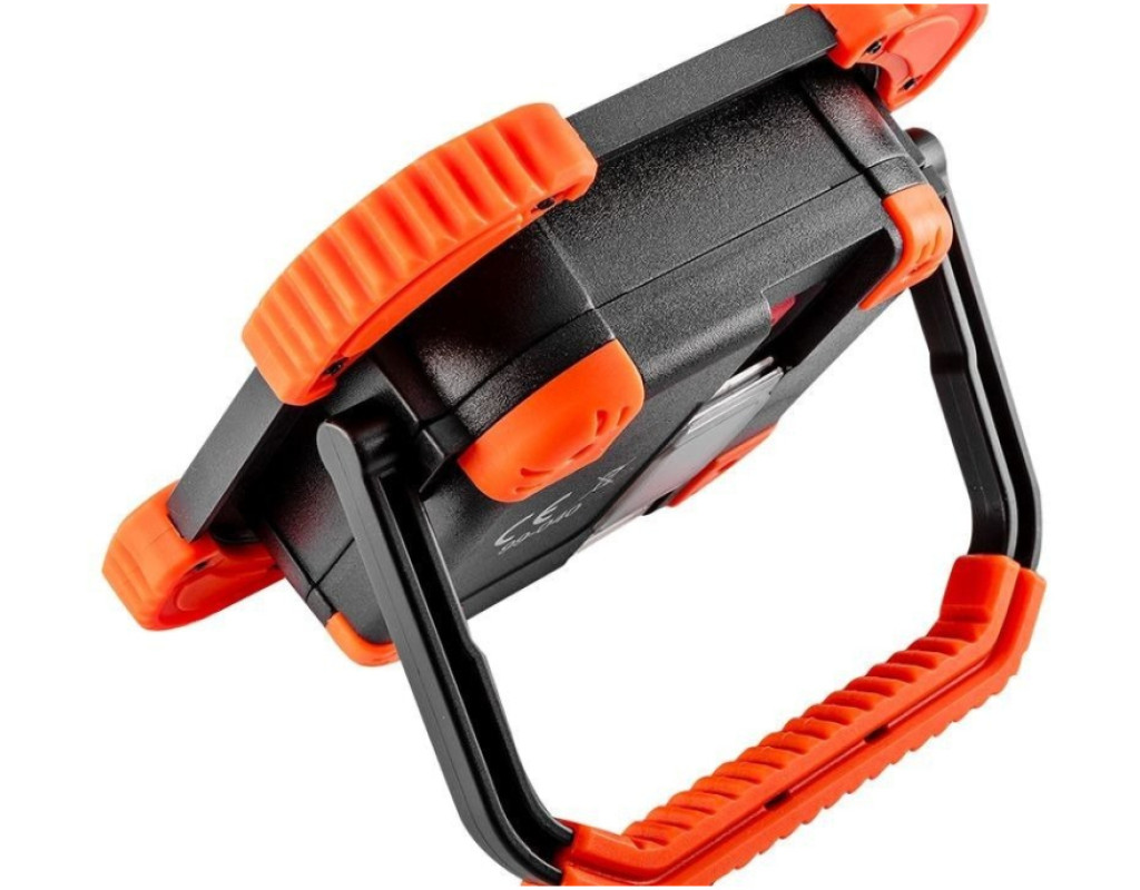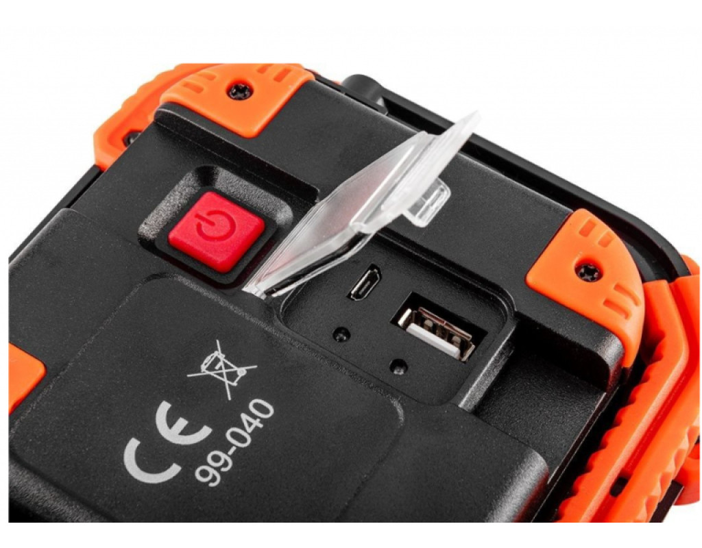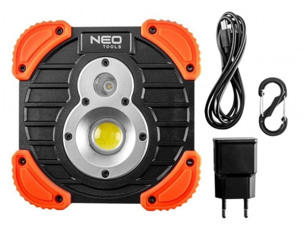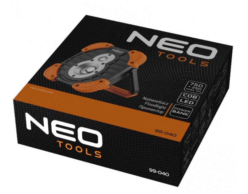 Акумуляторний прожектор Neo Tools 99-040 оснащений світлодіодами COB та CREE XPG зі світловим потоком 750 та 250 люмен та потужністю 10 Вт та 3 Вт. Прожектор живиться від літій-іонного акумулятора, що входить в комплект, 3,7 В ємністю 2600 мАг. Ліхтар має 3 функції освітлення: великий світлодіод, малий світлодіод та комбінований. Можна регулювати кут нахилу. Відповідність європейським стандартам безпеки підтверджено сертифікатом CE. Параметри