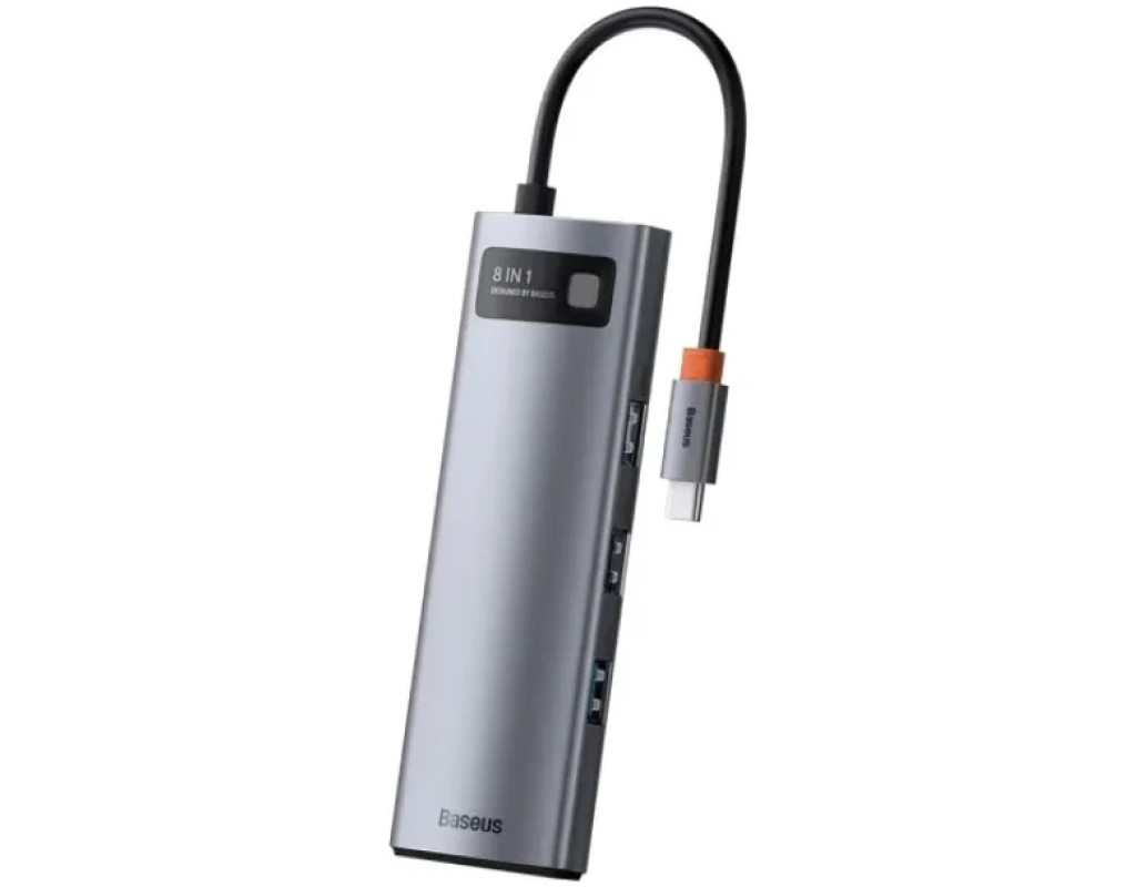 | Під'єднуйте більше пристроїв USB-хаб Baseus Metal Gleam допоможе вам розширити можливості вашого ноутбука та збільшить кількість роз'ємів. Роз'єми USB 3.0 дадуть вам під'єднувати інші ґаджети, як-от флешнакопичувачі, мишку, клавіатуру тощо. А наявність порту USB-C (PD) дасть змогу паралельно заряджати ваш ноутбук із максимальною потужністю 100 Вт. Під'єднуйте монітор, проєктор, телевізор та відтворення відео або презентації на великому екрані завдяки роз'єму 4K HD. Захисні властивості Конструкція хаба створена з алюмінію, який має високу міцність і забезпечує зносостійкість пристрою. Хаб обладнаний системою захисту від перевантаження, перегрівання або замикання, що додатково захищає ваші ґаджети від непередбачених ситуацій. 2 слоти для картки Завантажуйте файли та світлини на комп'ютер одночасно з двох карток: TF та SD. Швидкість передавання становить приблизно 60 Мб/с. Особливості: