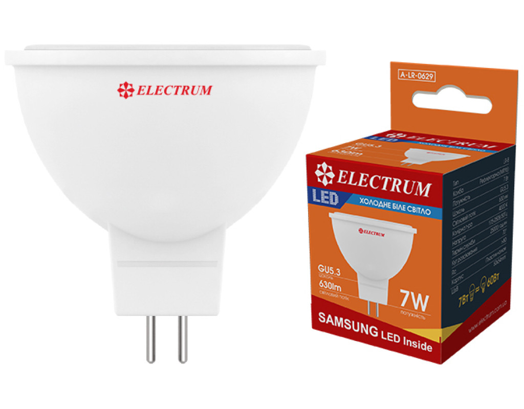 Лампа ELECTRUM GU5.3 (A-LR-0629) - рефлекторні світлодіодні лампи, що володіють світловіддачею 80 лм/Вт. Матове скло пом'якшує і розсіює світло. Придатні для використання в світильниках місцевого освітлення і точкових вбудованих світильниках. Рефлекторна лампа з цоколем GU5.3 використовується в точкових світильниках для освітлення робочих місць і для підсвічування елементів у житлових і офісних приміщеннях. Особливості: