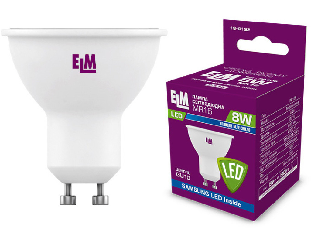 Рефлекторна світлодіодна ELM MR16 8W PA10S GU10 4000K - лампа має світлову віддачу понад 90 лм/Вт. Використовується у світильниках місцевого освітлення та точкових, вбудованих світильниках задля освітлення робочих місць, підсвітки елементів інтер'єру житлових та офісних приміщень.
