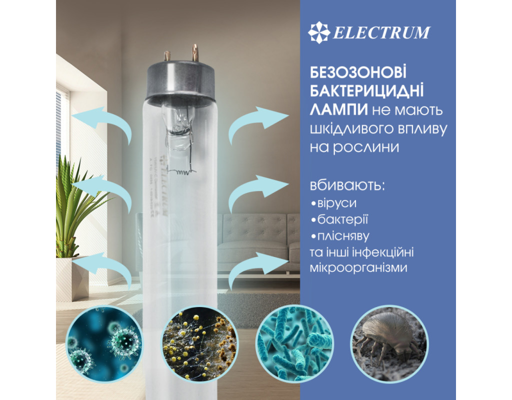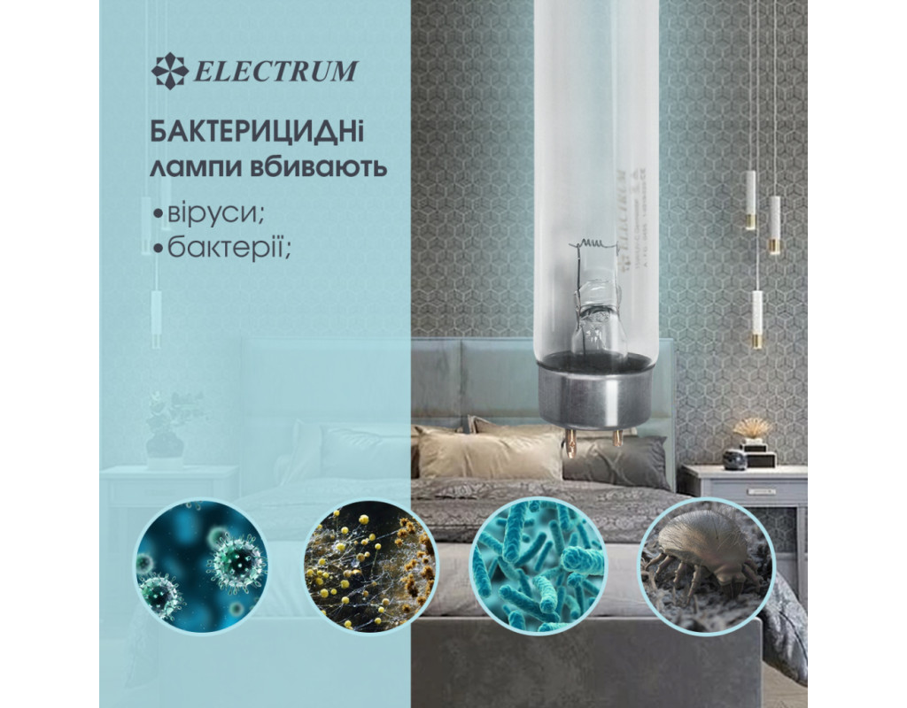 Бактерицидні люмінесцентні лампи Electrum забезпечують короткохвильове УФ-С випромінювання. Використовуються для швидкої дезінфекції повітря, води в лікарняних приміщеннях, харчової промисловості та у фармацевтичних підприємствах. Під час роботи не утворюють озон. |