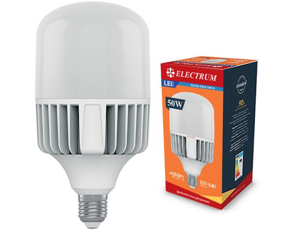 | Лампа світлодіодна промислова LP-50М 50W E27-E40 4000K в алюмопластиковому корпусі A-LP-1949 розрахована на використання у промислових приміщеннях та підходить за типом цоколя E27-E40. Вона має винятково високі показники світлового потоку (4500 lm), потужну світловіддачу (понад 90 лм/Вт). При цьому такі показники дані LED лампи видають при потужності 50 Вт, що аналогічно 400-ватним лампам розжарювання зі схожими світловими характеристиками.