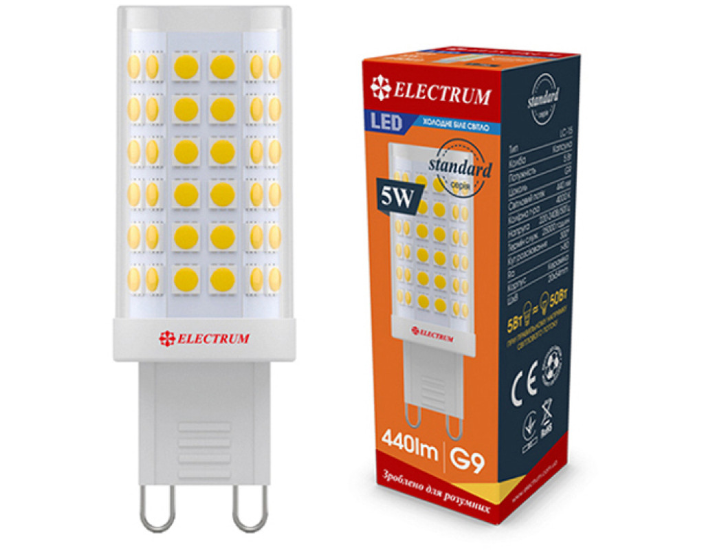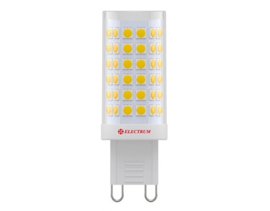 Світлодіодна лампа Electrum з керамічним корпусом та прозорою колбою у формі капсули, має світловіддачу більше 88 лм/Вт. Оснащена вбудованим джерелом живлення.Призначена для використання в світильниках зцоколем G9.