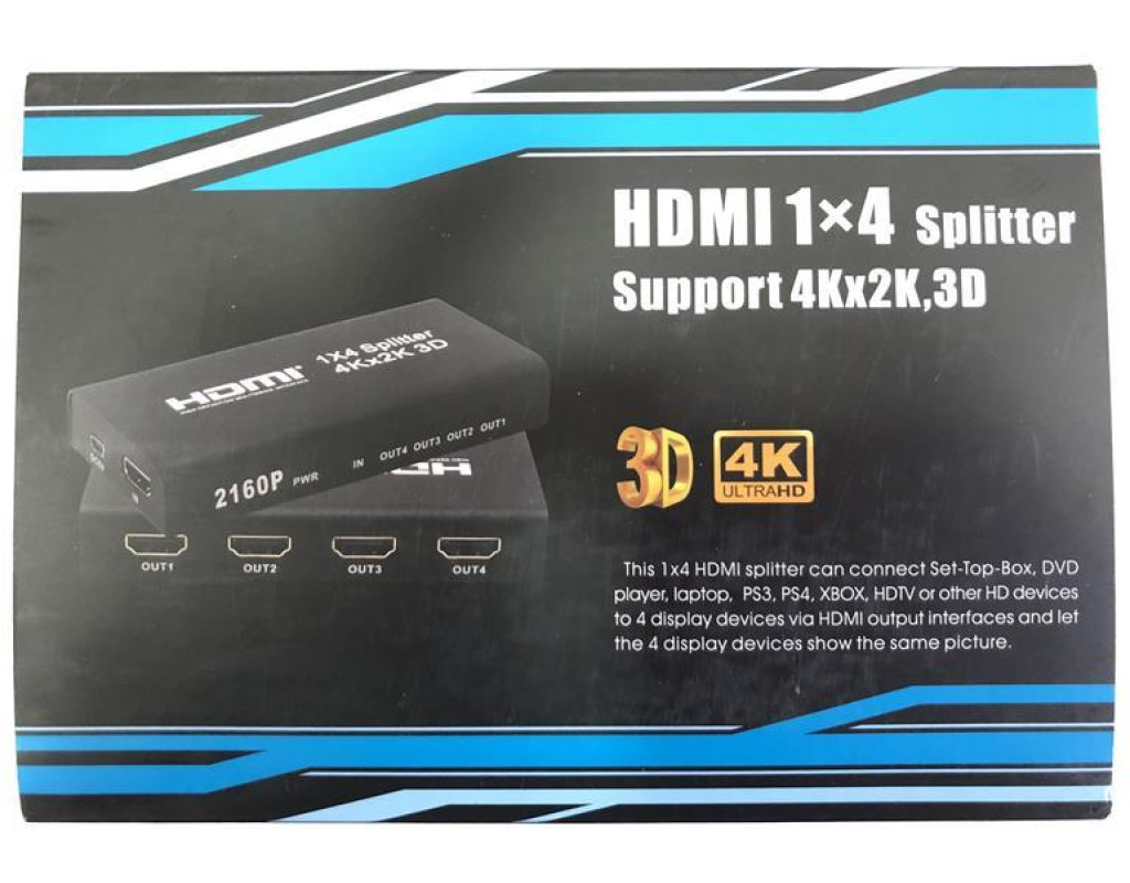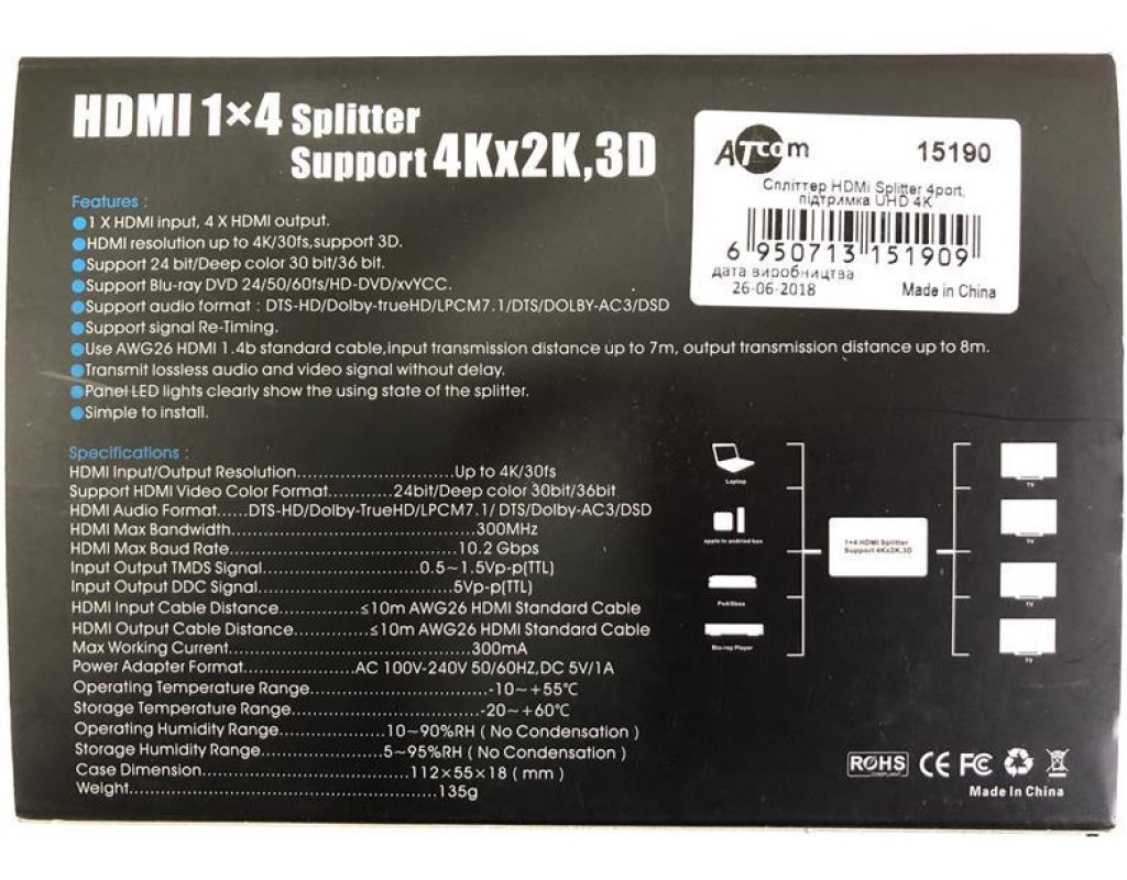 | Спліттер HDMI 1х4 Ultra HD (4Кх2К, 3D) ATcom це розгалужувач HDMI 1 вхід і 4 виходи, який розділяє цифровий сигнал HDMI з одного джерела (BlueRay, ноутбук, ресивер, плеєр, ігрова консоль) на два приймача у вигляді ТВ-дисплея (телевізор, панель, проектор) одночасно. HDMI розгалужувач має вбудований підсилювач, що дозволяє передавати сигнал 4Кх2К@30Гц до 15 метрів, 1080р @ 60Гц до до 25 метрів. Підтримує дозволу екрану до 4Kx2K@30Гц, 1080P@120Гц, 1080P і 3D@60Гц. |
