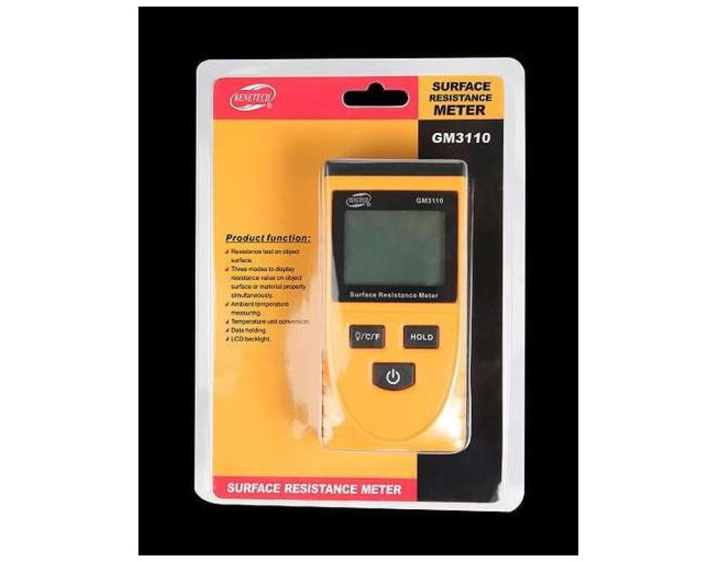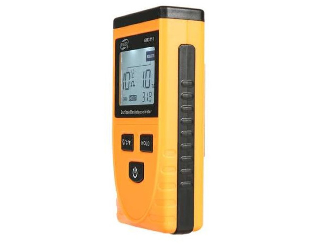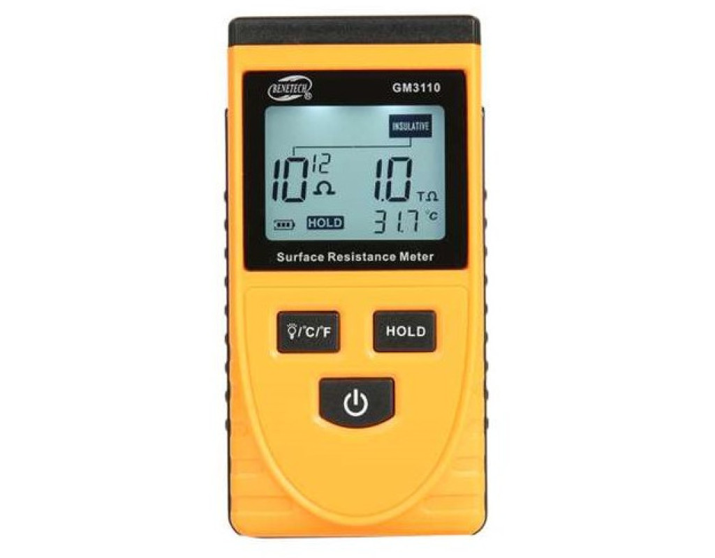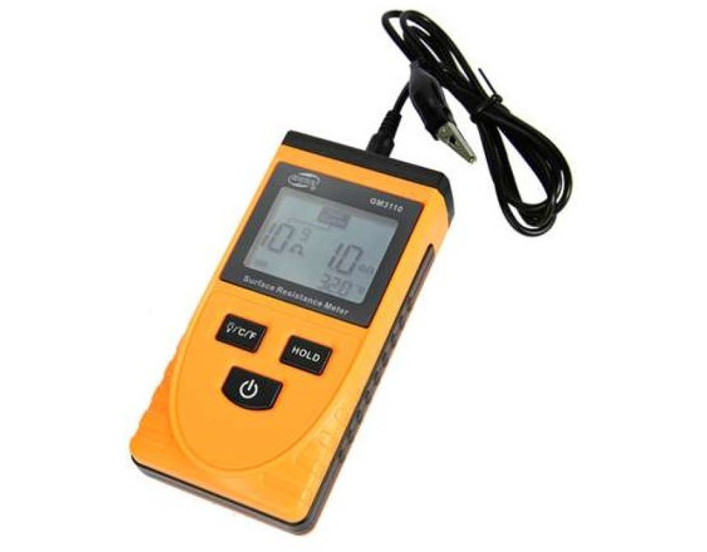 Benetech GM3110 призначений для вимірювання поверхневого опору матеріалу. Принцип його роботи заснований на вимірюванні питомої опору між двома електродами. Користуватися тестером опору GM3110 дуже просто. Необхідно розмістити його на поверхні досліджуваного матеріалу так, щоб електроди торкалися поверхні і щоб досліджуваний зразок був цілісним. Прилад визначає наскільки хорошим провідником виступає поверхню. Також він може виміряти опір по відношенню до землі. |
