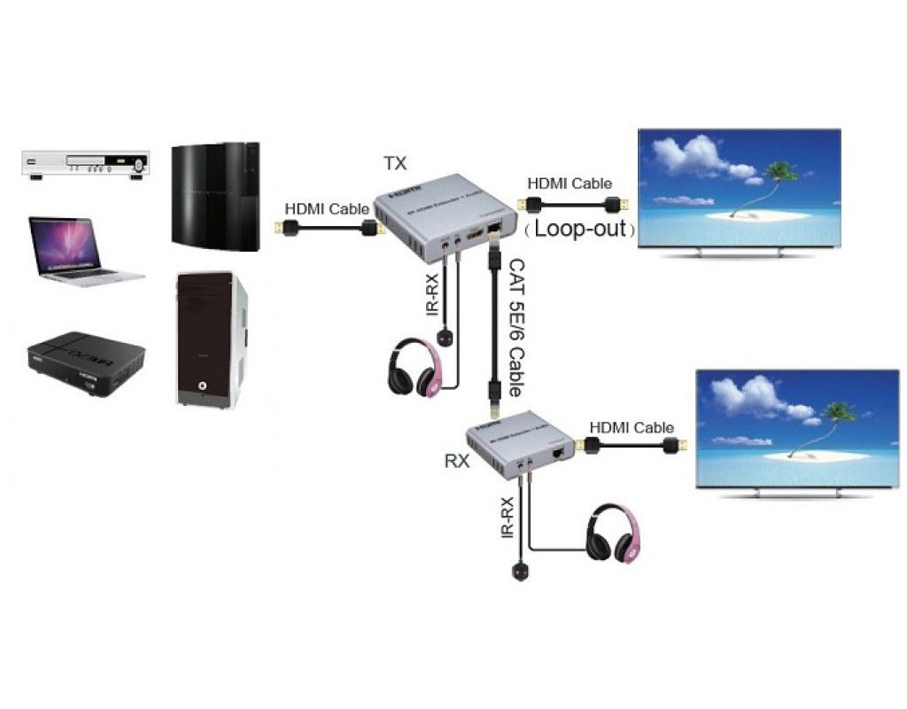 HDMI розширювач — модуль посилення сигналу до 100 м, 4K, HDMI кабель до 15 м, ІЧ. У розширювачі використовується один кабель cat5e або cat6 (рекомендується) замість кабелю HDMI для передавання високої чіткості сигналу на відстань до 100 метрів.