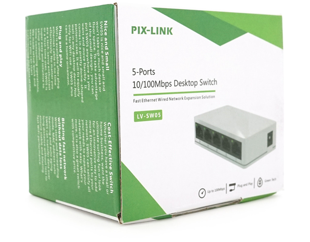 | Комутатор локальної мережі (switch) – це інтелектуальний пристрій, що забезпечує передачу пакетів даних. Комутатор оснащений портами 10 / 100 Мбіт / с з автопогодженням та роз`ємами RJ45. Всі порти підтримують функцію авто-MDI / MDIX, усуваючи необхідність використання кабелю з перехресними парами або портів з підтримкою функції Uplink. Технічні характеристики: Кількість портів: 5; Швидкість портів: 10 / 100 Мбіт / с з автопогодженням, з роз`ємами RJ45 (авто-MDI / MDIX); Управління потоком 802.3X, контроль зворотного потоку; Функція Auto-Uplink на кожному порту; Напруги живлення: 5 В; Струм споживання: 0,6 А; Енергоспоживання максимум: 3 Вт; Зовнішній блок живлення змінного. струму: 100 ~ 240 В, 50 / 60 Гц. |