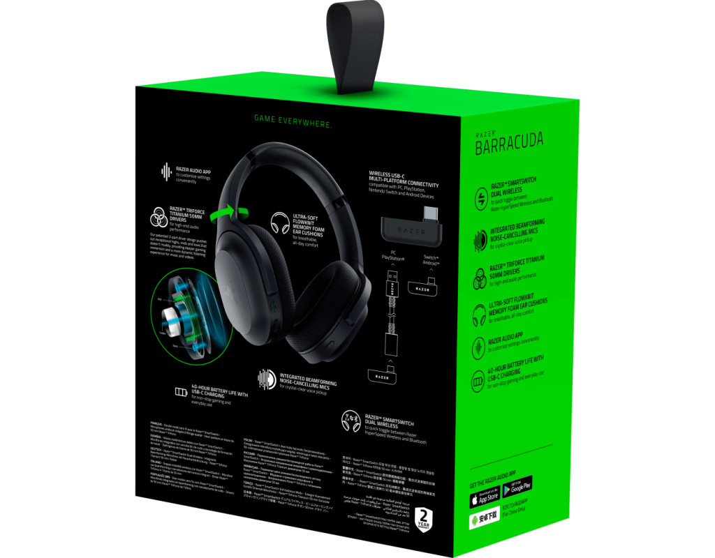 | Навушники Razer Barracuda Black (RZ04-03790100-R3M1) – це справжні Hi-Fi/High-End геймерські рішення, що відкривають нові горизонти в аудіо для всіх ваших пристроїв. Вони створені для гікових ігор, захоплюючих фільмів та динамічної музики, поєднуючи в собі передові технології та винятковий комфорт. З цими навушниками ви зможете насолоджуватись кришталево чистим звуком та високою якістю зв’язку, будь-яким чином під'єднавши їх за допомогою радіоканалу, Jack 3.5 мм, Bluetooth або USB Type-C. Ця мультиплатформна гарнітура з бездротовим підключенням стане вашим незамінним супутником як вдома, так і на вулиці. За допомогою інтелектуальної технології Razer Smartswitch ви без зусиль зможете переходити між режимами Razer HyperSpeed Wireless та Bluetooth 5.2, позволяючи вам не зупинятись, коли змінюєте джерело звуку з комп'ютера чи консолі на телефон або телевізор. Перемикання режимів відбувається практично миттєво, що дозволяє зберігати стабільність зв’язку навіть у русі. Навушники сконструйовані з урахуванням усіх деталей: їх повнорозмірна конструкція з наголов'ям надає неперевершений комфорт завдяки тканинним амбушурам з ефектом пам'яті, які м'яко облягають вуха, а також мають дихаючу поверхню, що перешкоджає перегріву. Вага всього 300 г ідеально відповідає критеріям зручності та безперервного використання навушників. Стабільність та якість зв’язку забезпечуються вбудованими спрямованими мікрофонами з функцією шумозаглушення, що налаштовується в залежності від вашого середовища. Таке рішення гарантує, що ваш голос завжди буде чітким і зрозумілим, навіть у шумних умовах. Окрім того, надвисоку якість звуку забезпечують випромінювачі Razer Triforce Titanium діаметром 50 мм, що розділяють звук на високі, середні та низькі частоти. Це робить ваші враження від ігор та медіа ще більш глибокими та реалістичними. Завдяки акустичному оформленню в закритому виконанні та підтримці 7.1 канального звуку, ви отримуєте повний контроль над ігровими ситуаціями, з повним зануренням у атмосферу гри чи фільму. Насолоджуйтесь безперебійною роботою протягом 40 годин від одного заряду завдяки потужній батареї з інтерфейсом зарядки USB Type-C. Лише 1.5-метровий кабель з L-подібним штекером стане у нагоді, коли вам знадобиться під'єднання по дроту в критичних ситуаціях. Razer Barracuda Black (RZ04-03790100-R3M1) – це справжній апгрейд для вашого аудіосвітосприйняття, що пропонує унікальну комбінацію функцій для безмежних можливостей. Випереджайте час разом із пристроєм, що адаптується до ваших потреб і веде у світ нових звукових вражень. |