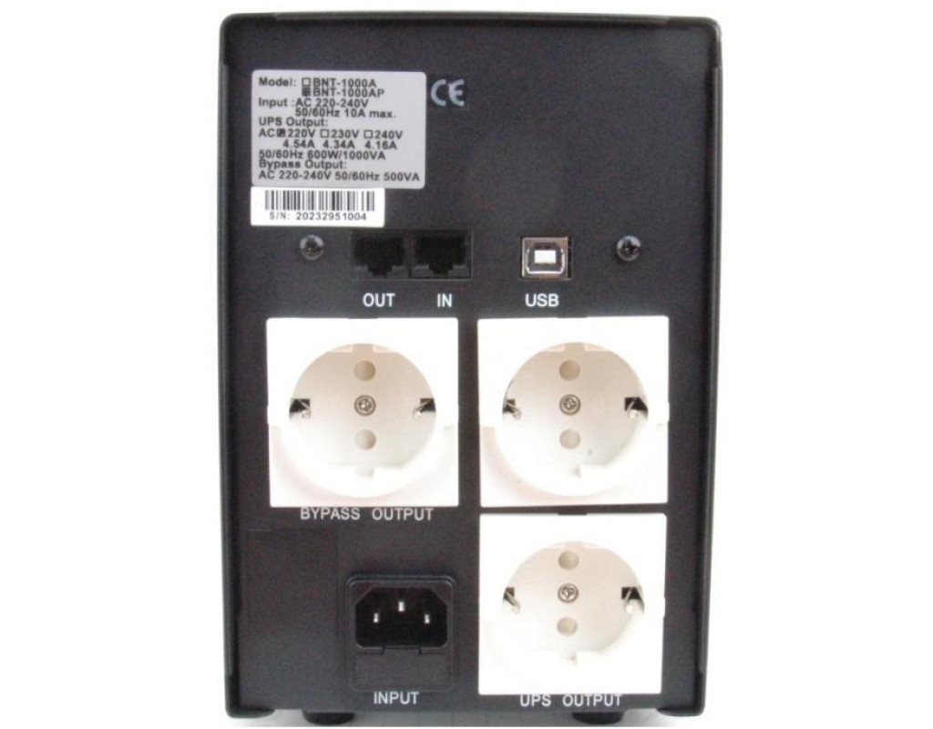 | Powercom BNT-1000 AP(BNT-1000 AP USB Schuko) - автоматичний пристрій, що дозволяє підключеному устаткуванню деякий час працювати від акумуляторів ИБП, при пропажі електричного струму або при виході його параметрів за допустимі норми. Powercom BNT-1000 AP Schuko здатний коригувати параметри (напругу, частоту) електроживлення. Часто застосовується для забезпечення безперебійної роботи комп'ютерів. Може поєднуватися з різними видами генераторів електроенергії. Діапазон вхідної напруги без переходу на батареї складає від 155 до 275В. Через інтерфейсний кабель USB підключається до комп'ютера, а на комп'ютер встановлюється спеціальне програмне забезпечення. При перериванні живлення від мережі через інтерфейсний кабель подається сигнал до ПК і програмне забезпечення "м'яко" вимикає ПК, не чекаючи розряду батарей. У ИБП Powercom BNT-1000 AP Schuko також є захист телефонної лінії : вхід і вихід RJ - 11 для підключення телефону або модему до телефонної лінії. |