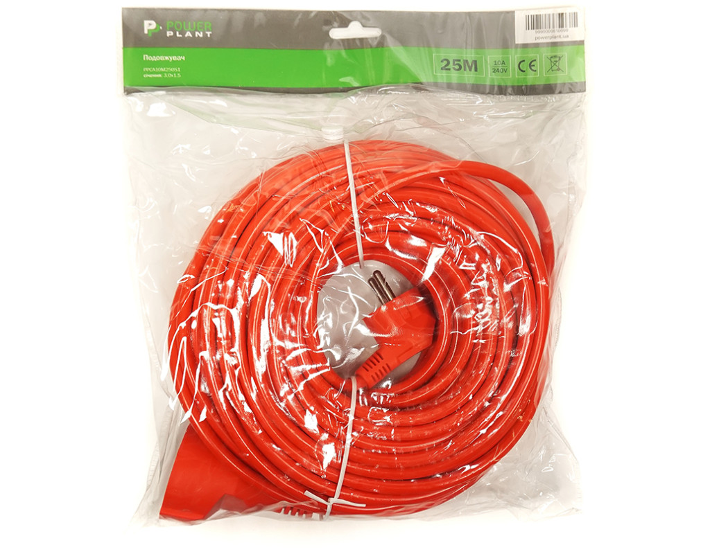призначений для підключення широкого спектру комп'ютерної, побутової та електронної техніки до електричної мережі змінного струму з номінальною напругою не більше 240В і номінальним струмом не більше 8 А. Кабель довжиною 25 м дозволить підключити техніку в місцях віддалених від стаціонарних розеток. Подовжувач оснащений розеткою євростандарту з заземленням. Подовжувач PowerPlant стане відмінним помічником в будинку, офісі або на дачі.