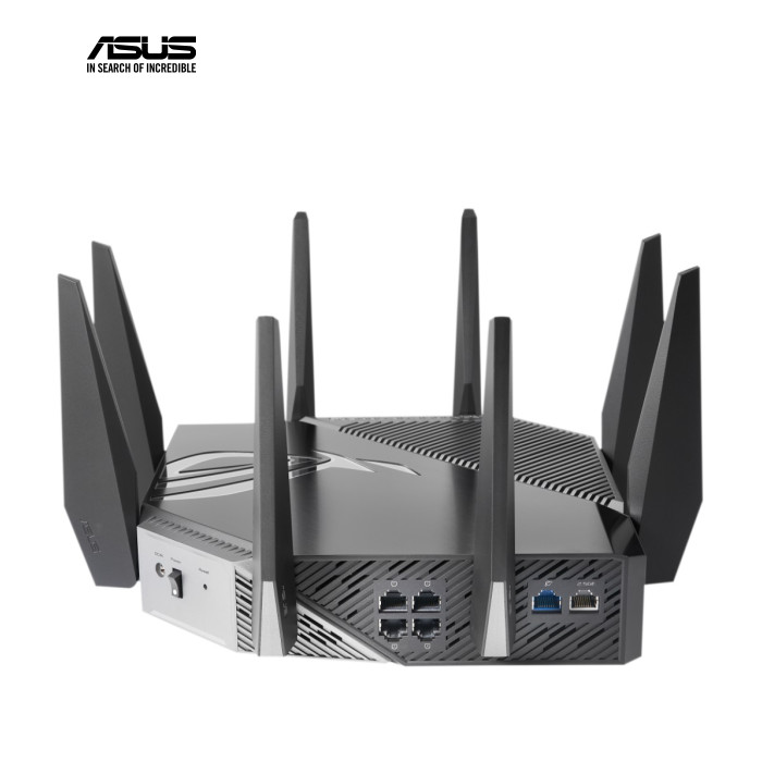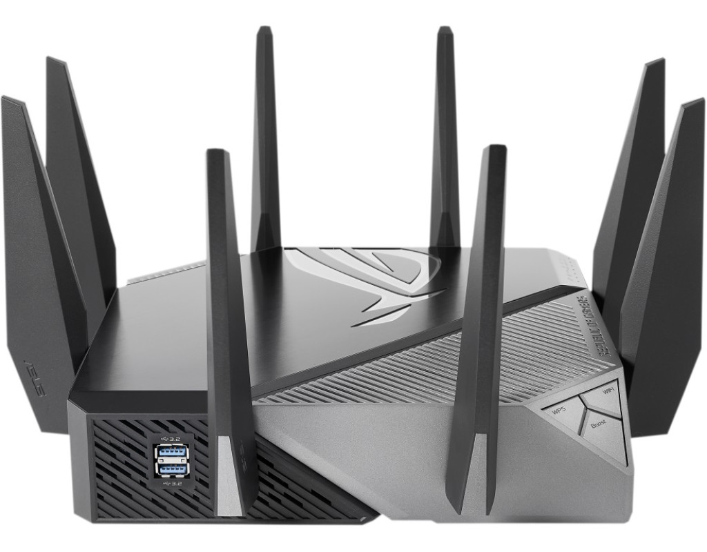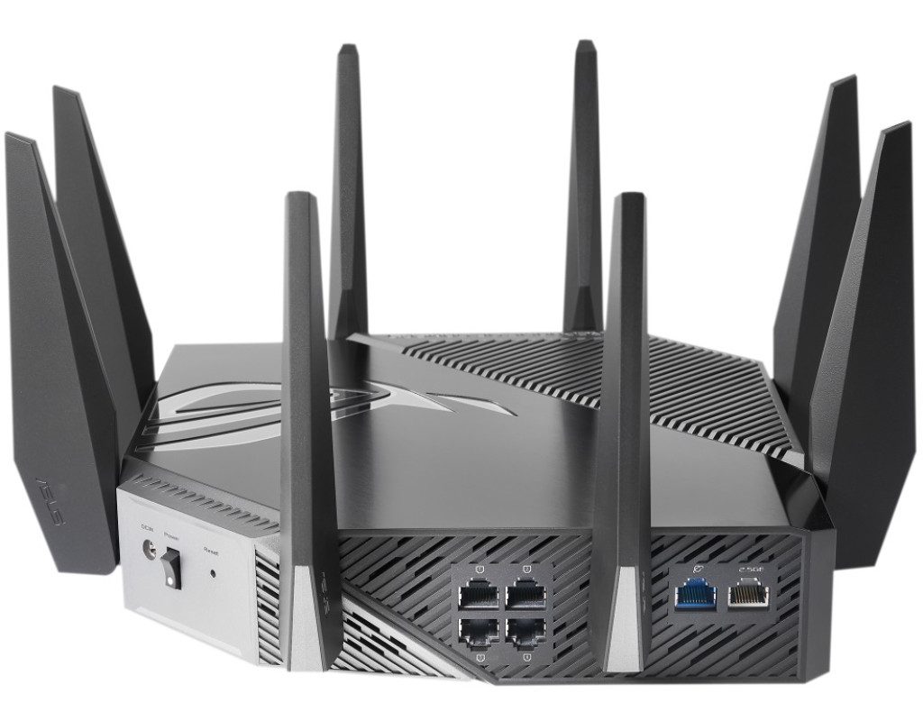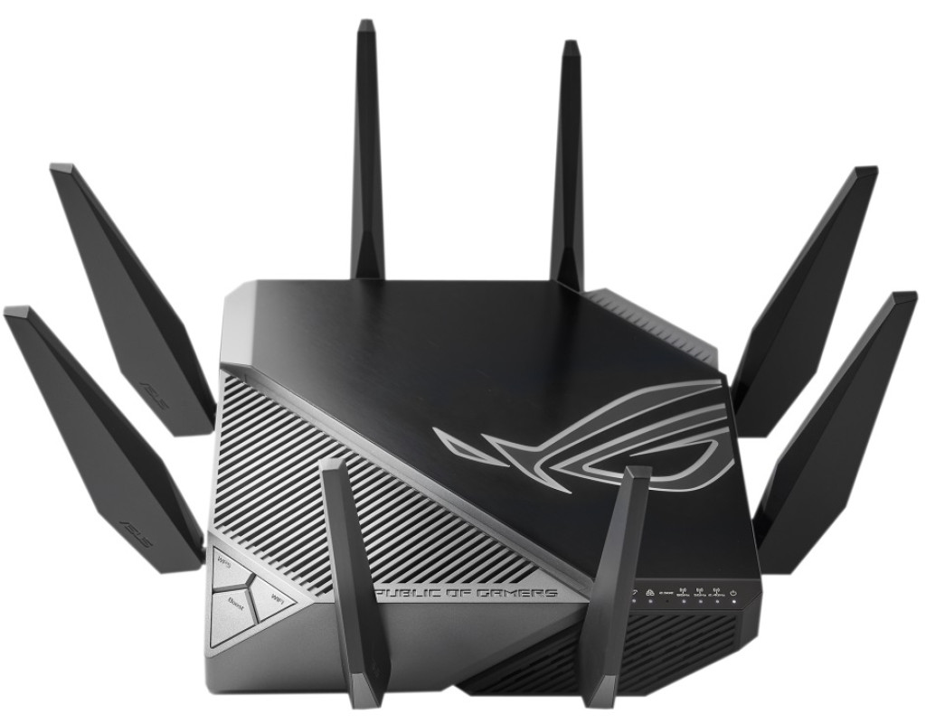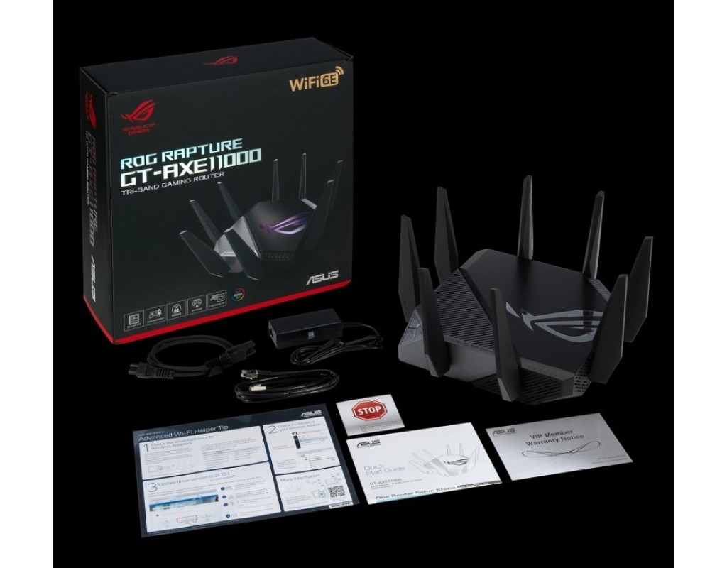| Тридіапазонний ігровий маршрутизатор GT-AXE11000: стандарт Wi-Fi 6E (802.11ax), новий діапазон 6 ГГц, порт 2.5G Ethernet (WAN/LAN), сумісність із PS5, об’єднання каналів WAN, VPN Fusion, трирівневе прискорення ігор, безкоштовні засоби інформаційної безпеки мережі, підтримка AiMesh