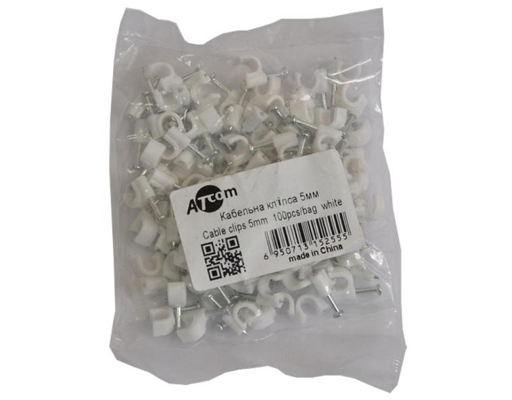 | Пластикові скоби для кріплення кабелю використовують для фіксування кабелю або проводу. Скоба Atcom для кріплення кабелю 5мм 100шт (15255) призначена для швидкого і надійного кріплення круглих проводів і кабелю до дерева, штукатурки, цегли, бетону. Для кріплення кабелю діаметром 5 мм. Скоби мають захисну конструкцію кабель або провід від механічних пошкоджень. Застосування скоби - вкласти кабель або провід, зафіксувати за допомогою гвинта (саморіза або цвяха). |