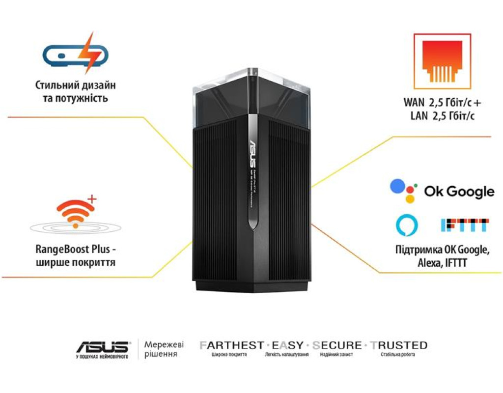 Більше потоків, більша пропускна здатність ZenWiFi Pro ET12 – це 12-потоковий пристрій із загальною швидкістю передачі даних до 11000 Мбіт/с. Він відмінно підходить для найбільш завантажених домашніх мереж, де необхідно одночасно передавати та отримувати дані великої кількості пристроїв на високій швидкості та позбутися мертвих зон. RangeBoost Plus RangeBoost Plus - найновіша і найпотужніша версія відомої фірмової технології ASUS RangeBoost, яка покращує покриття для всіх пристроїв Wi-Fi, включаючи застарілі пристрої. Використовуючи флагманський чіпсет Broadcom стандарту Wi-Fi нового покоління та 64-розрядний 4-ядерний процесор із тактовою частотою 2 ГГц, RangeBoost Plus спирається на численні ексклюзивні технології ASUS для розширення радіусу дії сигналу та покриття мережі Wi-Fi (до 38%). Відмінна масштабованість Технологія ASUS AiMesh дозволяє легко додавати додаткові вузли для покращення покриття чи розширення функціональності. Роль вузла може виконувати будь-який AiMesh-сумісний маршрутизатор. Порти LAN та WAN 2.5G Ethernet ZenWiFi Pro ET12 оснащений LAN- та WAN-портом стандарту 2.5G Ethernet, тому ви можете насолоджуватися повною швидкістю 2.5 Гбіт/с по всьому шляху: від провайдера до сумісного пристрою. Новий діапазон 6 ГГц для стабільного backhaul-каналу Через зростання кількості домашніх пристроїв частотні діапазони 5 ГГц та 2.4 ГГц стають все більш переповненими. Але оскільки новий діапазон 6 ГГц зарезервований виключно для Wi-Fi 6E, він створює взаємні перешкоди з пристроями минулих поколінь. Тому він ідеально підходить для використання у ролі магістрального каналу для з'єднання вузлів між собою. Для цієї мети ви також можете використовувати дротове з'єднання Ethernet. Крім того, можна вибрати автоматичний режим та дозволити ZenWiFi Pro ET12 самому вибрати найкращий тип підключення на основі аналізу існуючого середовища. Вибір за вами! Голосове управління ZenWiFi Pro ET12 працює з голосовими сервісами Google та Alexa для керування маршрутизатором. Створено для продуктивності ZenWiFi Pro ET12 розроблений для забезпечення максимальної продуктивності: завдяки новітньому чіпсету та процесору Broadcom пропускну здатність Wi-Fi збільшили до 18%. У пристрої використовуються вісім зовнішніх антен, розташованих під оптимальним кутом у спеціальному прозорому відділенні у верхній частині маршрутизатора. Це дозволяє мінімізувати перешкоди та максимально розширити зону покриття. Інформаційний захист корпоративного класу для домашніх мереж Інформаційна безпека стає все більш важливим аспектом домашніх мереж, у міру того, як до них підключається все більше пристроїв, що особливо не володіють власними антивірусними засобами. Ось чому в ZenWiFi Pro ET12 реалізовано систему захисту від онлайн-загроз AiProtection Pro, яка пропонується абсолютно безкоштовно, без абонентської плати. Також у ній підтримуються стандарт WPA3 та батьківський контроль. Захищене з'єднання Де б ви не були, технологія Instant Guard забезпечує безпечний доступ до Інтернету за допомогою ZenWiFi Pro ET12 та шифрованого VPN-з'єднання. Візьміть із собою домашню мережу та забудьте про сторонні сервіси VPN! |