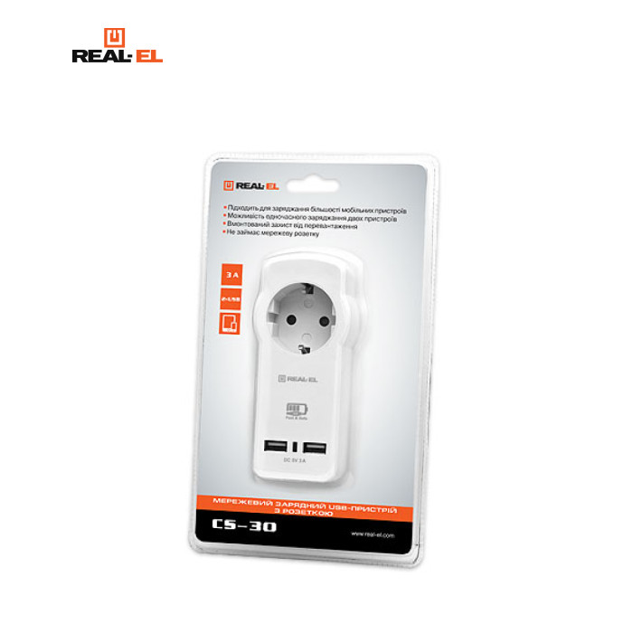 | Мережевий зарядний USB-пристрій з розеткою призначений для заряду акумуляторів або живлення портативних пристроїв від побутової електромережі і одночасного використання його в якості силової розетки. Можливість одночасної зарядки двох пристроїв. Вбудований захист від перевантаження. Номінальна вхідна напруга ~ 230 В. Вхідний струм 16 A. Максимальний вихідний струм 3100 мА. Вихідна потужність 15 Вт. |