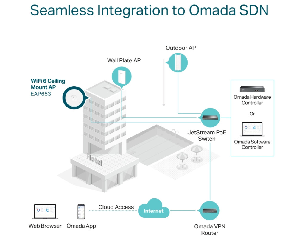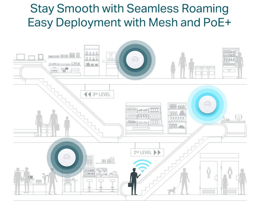 Безшовна інтеграція з Omada SDN Програмно-конфігурована мережа Omada SDN включає мережні пристрої, такі як точки доступу, комутатори і шлюзи, забезпечуючи стовідсоткове хмарне управління і формуючи масштабовану мережу з управлінням з єдиного інтерфейсу. Автоматичний вибір каналу та регулювання потужності Підвищує продуктивність Wi-Fi і значно знижує рівень перешкод, автоматично вибираючи канал і регулюючи рівень потужності сусідніх точок доступу, що знаходяться у тій самій мережі. Просте підключення, мінімум проводів Завдяки технології Mesh точки доступу EAP Omada дають можливість обійтися без зайвих проводів за рахунок бездротового розширення наявної Wi-Fi мережі у важкодоступних місцях. Оптимізована продуктивність мережі Розумна самоорганізація вибере найбільш оптимальний шлях між точками доступу, а самовідновлення дозволить залишатися в мережі, навіть якщо одна з точок доступу вийде з ладу. Швидкий роумінг Забезпечує безперервне підключення на пристроях клієнтів при їх переміщенні за рахунок автоматичного перепідключення клієнтів до точок доступу з найбільш якісним сигналом. Тонкий корпус Виняткова продуктивність у компактному корпусі - EAP653 відмінно впишеться в будь-який інтер'єр і не займе багато місця.