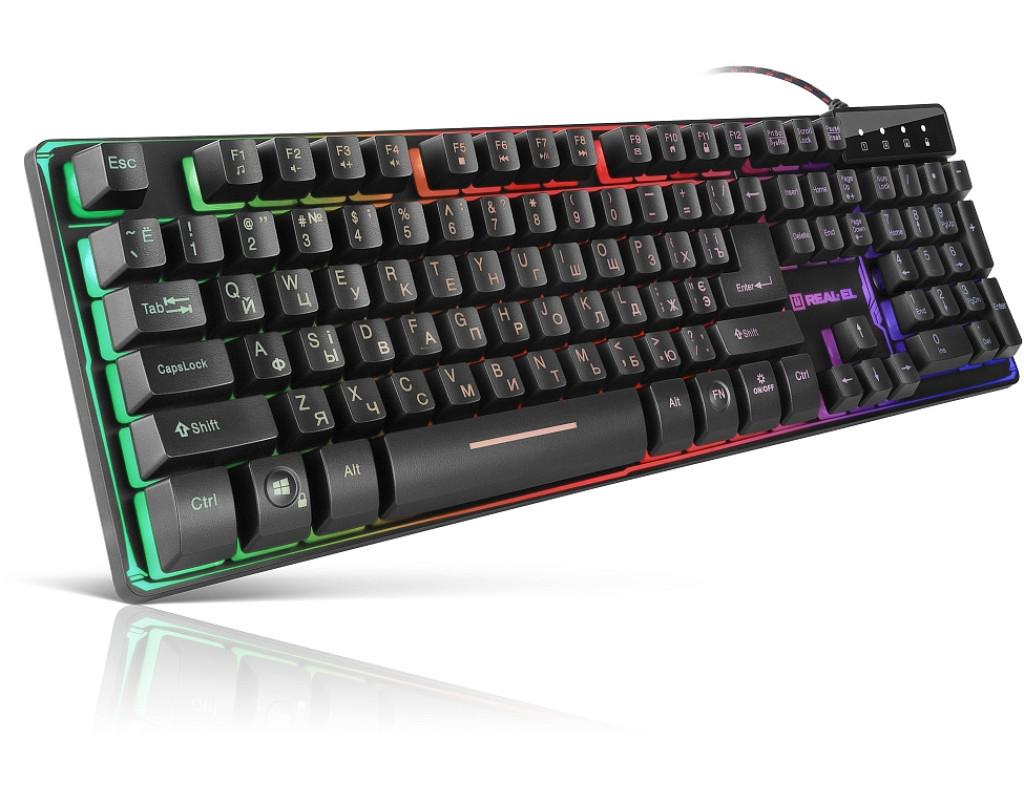 | Особливістю ігрової клавіатури REAL-EL GAMING 8700 Backlit є: ергономічний ігровий дизайн, металева основа, знижений шум при роботі, тихий та чіткий хід клавіш, 12 Fn кнопок швидкого доступу до Windows, Інтернету та Мультимедіа, кабель у тканинній оплетці. Багатокольорове підсвічування клавіш з різними режимами яскравості, є режим "дихання". |
