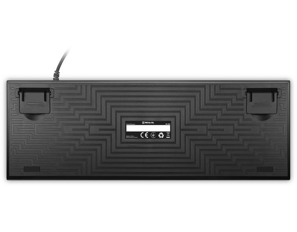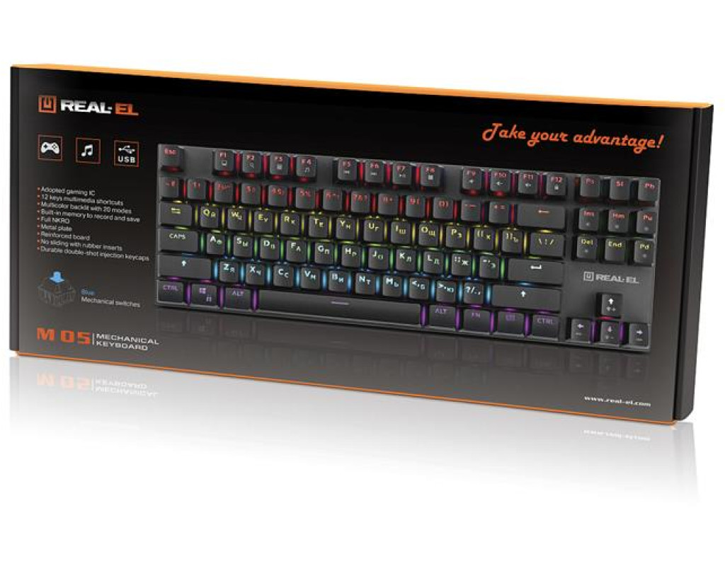 Виробник також подбав про надійність свого виробу додавши металеву пластину, посиливши конструкцію плати. У контактах клавіш використовуються механічні перемикачі Huano Blue, а самі клавіші стійкі до стирання. Заявлене напрацювання на відмову становить понад 60 млн. натискань. Модель реалізована у форматі TKL, завдяки чому вона не займає багато місця. REAL-EL M 05 - незамінний помічник як в іграх, так і в роботі. |