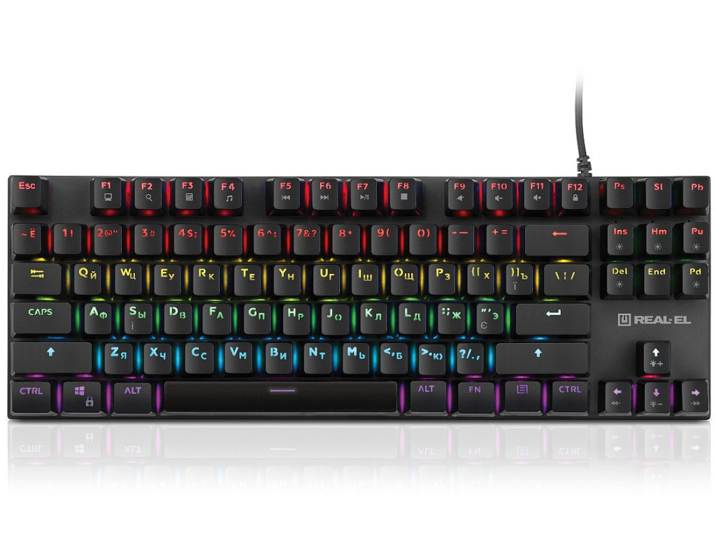 | Висока надійність, швидкий час реагування, необмежена кількість одночасних натискань клавіш відрізняють механічну ігрову клавіатуру REAL-EL M 05. Дана модель обладнана різнокольоровим підсвічуванням з різноманітними комбінаціями, в кожній комбінації по 4 види підсвічування, які змінюються при повторному натисканні відповідної комбінації. Усього 20 видів підсвічування, що дозволяє створити на ігровому місці як агресивне середовище для онлайн-шутерів, так і атмосферу зосередження та концентрації для квестів та стратегій.