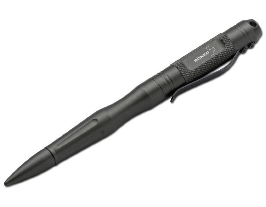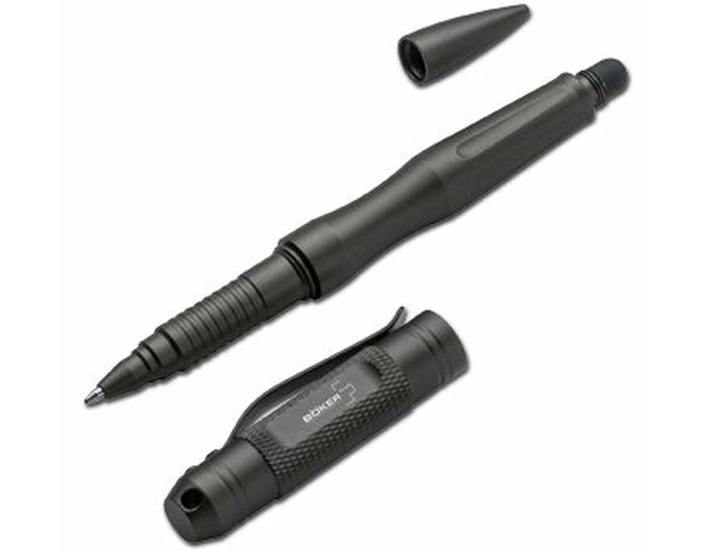Враховуючи все більше поширення планшетних комп'ютерів, тактична ручка Boker Plus iPen Security забезпечена гумовим накінечником для використання на сенсорних екранах, який добре захищений задньою кришкою, що відкручується. Як завжди, великий ковпачок передньої частини приховує стандартний кульковий накінечник. Полірований алюмінієвий корпус має додаткову поверхню для нанесення гравіювання. Сумісна зі змінними стрижнями Parker giant та Fisher Space Pen. Для заміни стрижня ручка забезпечена різьбою, яка відкручується проти годинникової стрілки. Це запобігає випадковому розкручуванню корпусу ручки під час відкручування ковпачка. |