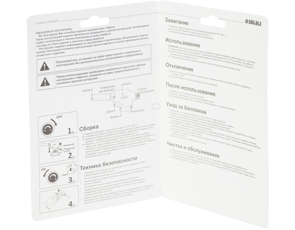 Пальник газовий стандарт із п'єзопідпалювачем Sigma (2901411) застосовується в побутових, ремонтних, будівельних і туристичних цілях. Наприклад, під час карамелізації цукру на десертах, глазурування, надання кольору та текстури, підпалювання міцних напоїв. Також використовується для розпалювання дров і вугілля, відтавання труб, замків, підігріву автомобільних двигунів, випалювання старої фарби, паяння мідних труб і виготовлення ювелірних виробів. Можливе використання з газовими балонами ТМ Sigma. Переваги: