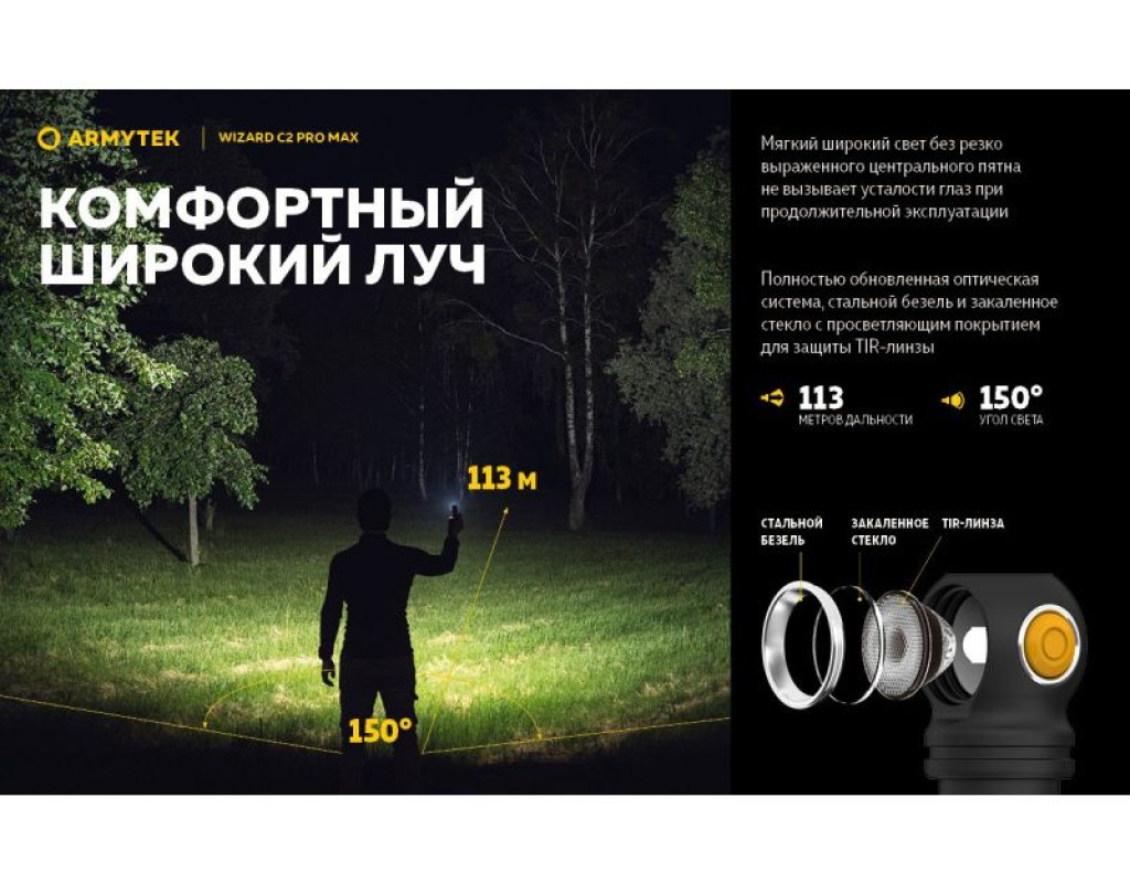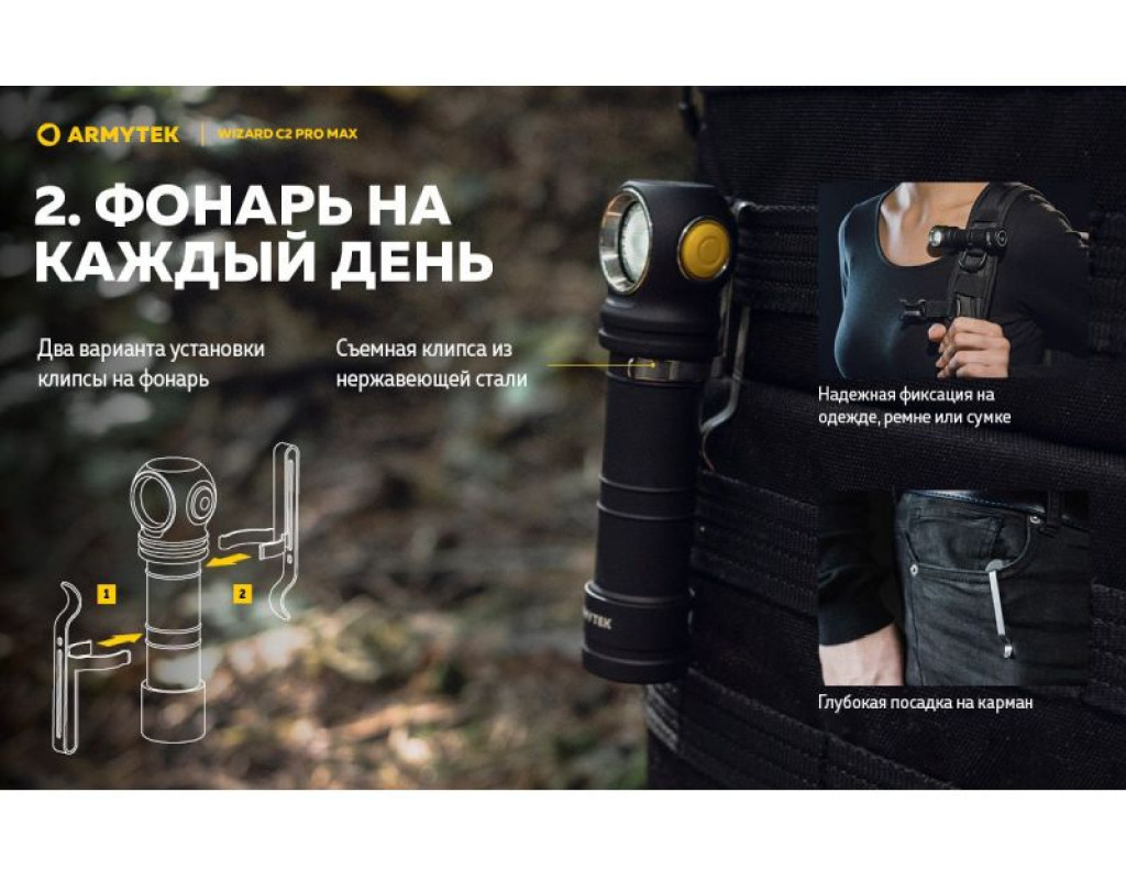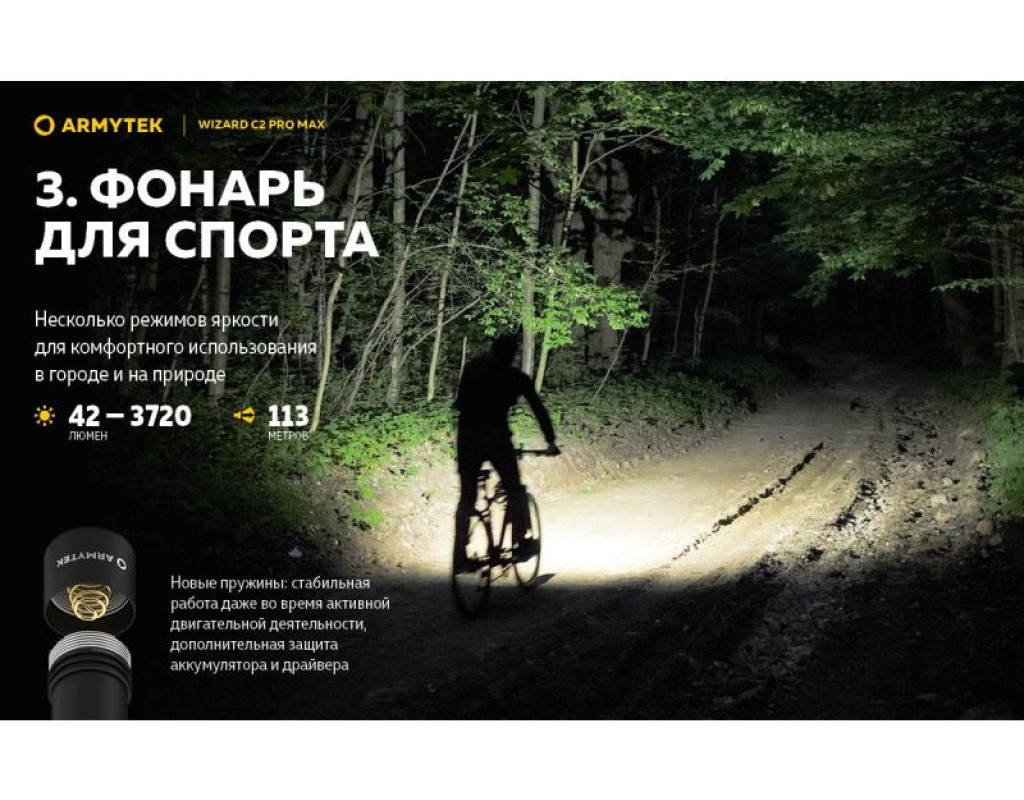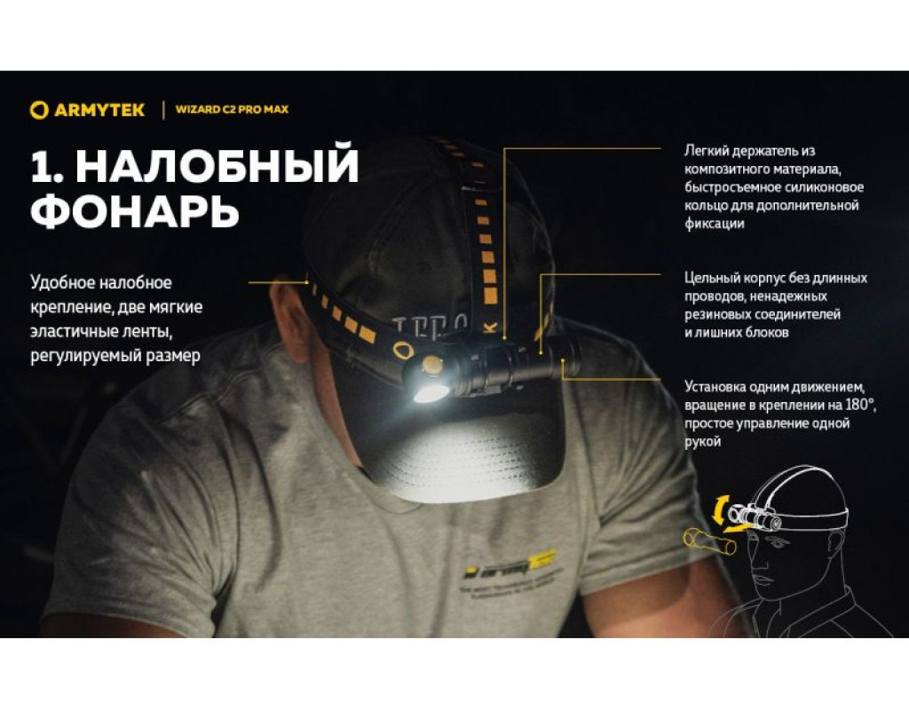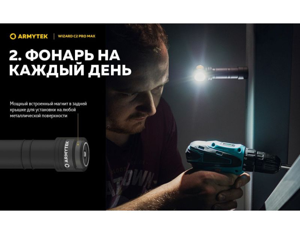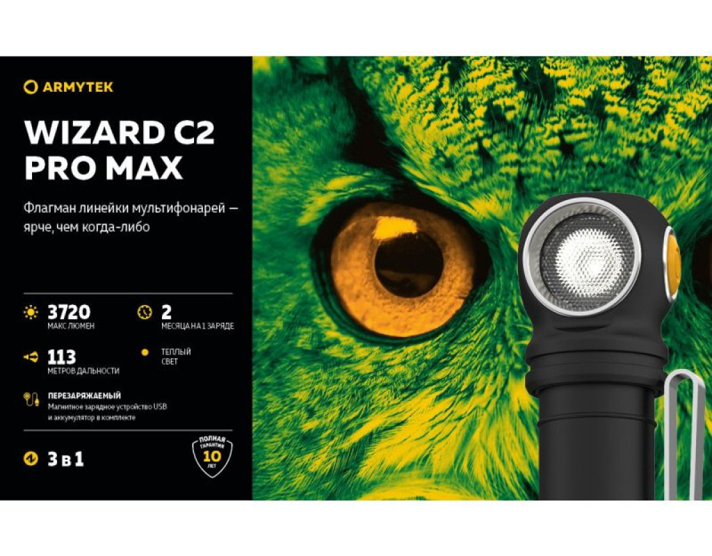 | Ліхтар Armytek Wizard C2 Pro Max Magnet USB Warm (F06701W) — це справжній витвір технологічного мистецтва від канадського бренду Armytek. Цей налобний ліхтар поєднує у собі три функції: налобного, інспекційного та портативного ліхтаря, що робить його незамінним помічником як у повсякденному житті, так і під час активного відпочинку. Базується на потужному світлодіоді Cree XHP70.2, який забезпечує надзвичайно яскраве освітлення в 4000 люмен. Це дає можливість заливає весь простір навколо вас м’яким теплим світлом, що робить ліхтар ідеальним для роботи на різних дистанціях або у великих просторих зонах. Дальність світлового потоку в 114 метрів дає змогу освітити найтемніші куточки, надаючи вам максимальної видимості. Інноваційний дизайн ліхтаря створений таким чином, щоб забезпечити максимальний захист від будь-яких зовнішніх факторів. Його корпус виготовлений з високоякісного анодованого алюмінію, який застосовується в аерокосмічній техніці. Ліхтар має клас захисту IP68, що робить його вологонепроникним та ударостійким: він витримує падіння з висоти до 10 метрів і може працювати під водою на тій же глибині. Функціонуючи на потужному акумуляторі 21700 Li-Ion ємністю 5000 мАч, цей ліхтар здатний безперебійно працювати протягом тривалого часу в різних режимах яскравості. Оснащення зарядною магнітною станцією забезпечує швидке та зручне заряджання без потреби виймати елементи живлення, що береже ваш час та нерви. У ліхтарі реалізовано 10 режимів роботи, починаючи від турбо-режиму з 4000 люмен, здатного працювати 3 години 15 хвилин, і закінчуючи економічним режимом у 0,35 люмен, який триватиме до 2 місяців. Є три режими стробоскопа, які корисні для подачі сигналів або залучення уваги. Знаходження правильної потужності світла стає легким завдяки зручній кнопці перемикання режимів. Вона розташована зручно, щоб керувати ліхтарем однією рукою навіть у темряві. Покращена оптична система зі спеціальною TIR-лінзою гарантує, що ви отримаєте безперебійний світловий потік без відблисків. Комплектація ліхтаря включає кліпсу для кріплення, 2 запасні ущільнювальні кільця та кріплення на голову, що дозволяє без проблем адаптувати використання в різних умовах. Кріплення дозволяє повертати ліхтар на 180 градусів, надаючи змогу освітлювати обране місце під потрібним кутом. З Armytek Wizard C2 Pro Max ви отримуєте не просто ліхтар, а справжній мультиінструмент освітлення, який стане незамінним для походів, велосипедних прогулянок, спеціальних індустріальних завдань, а також у повсякденних побутових умовах. Насолоджуйтесь якістю світла, надійністю та бездоганним дизайном, що підкреслює ваш стиль жити яскравіше! |