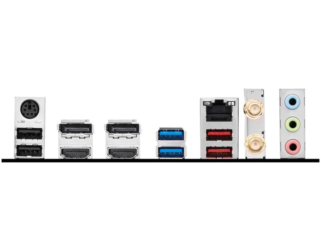 1 x PS/2, 1 x RJ45, 2 x DisplayPort, 2 x HDMI, 2 x USB 2.0, 2 x USB 3.2 Gen 1, 2 x USB 3.2 Gen 2 Type-A, 3 x Audio, Wi-Fi / Bluetooth Antenna |