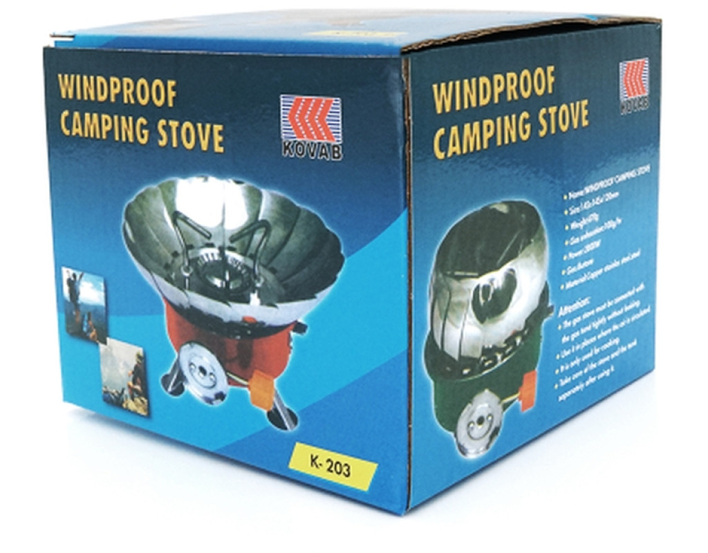 Туристичний газовий пальник K-203 з п'єзопідпалом та захистом від вітру під газові балони бутан. Зверніть увагу на зручність складаних ніжок, підставки, а головне не забудьте - сірники залишаємо вдома, у пальнику встановлений п'єзорозпал . Основні параметри та характеристики печі K-203: