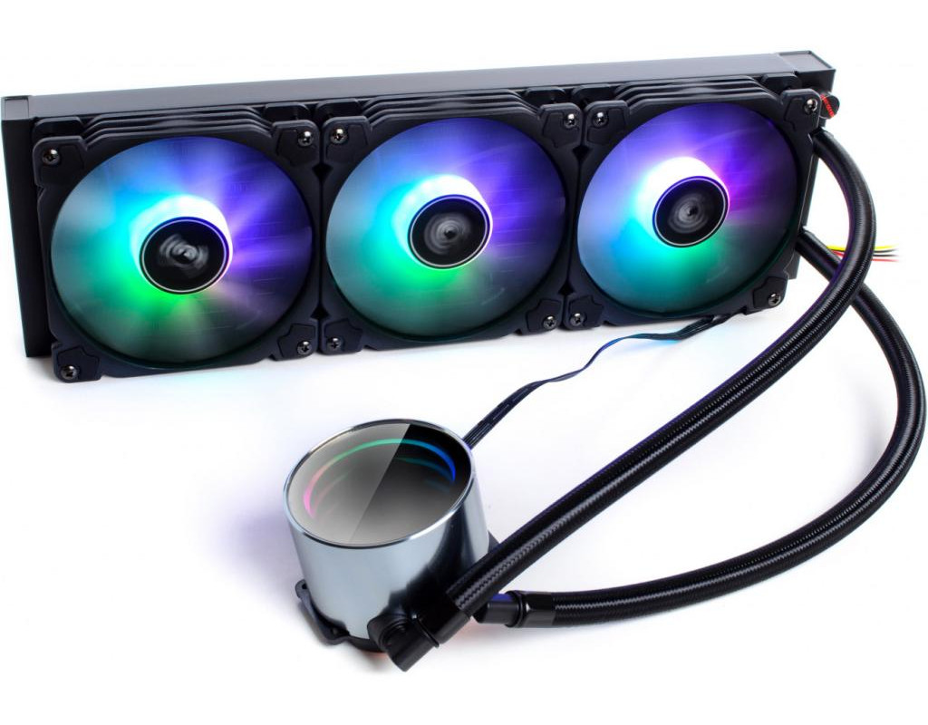 QUBE QB-OLWC360C — це закрита система рідинного охолодження з двосекційним радіатором і трьома 12 см вентиляторами з кольоровою RGB-підсвіткою. Продукт створений спеціально для комп'ютерних ентузіастів і буде відмінним вибором тих користувачів, яким необхідно більш просунуте, в порівнянні з повітряним кулером, ефективне рішення для охолодження навіть потужного процесора. І щоб при цьому не потрібно було б турбуватися про можливі проблеми сумісності або відсутності необхідних запчастин в комплекті, правильного кількості фітингів чи довжини з'єднувальної трубки. Поєднаний з вбудованою потужної помпою процесорний водоблок виконаний з міді з масивною основою для кращого відведення тепла від чіпа центрального процесора. Завдяки продуктивному насосу холодоагент швидко проходить по всьому контуру, що сприяє ефективному охолодженню CPU, а відвідні, армовані чорним обплетенням, шланги гарантують максимальну міцність і зносостійкість протягом всього терміну експлуатації. Вбудований в тіло помпи модуль з кільцевою LED-підсвічуванням дозволить урізноманітнити внутрішній дизайн ПК. 400 мм радіатор системи забезпечує неймовірно високу площу розсіювання. Три 120-мм кулери оснащені RGB-світлодіодами, що дозволяють реалізовувати багатоколірні світлові ефекти. Дані вентилятори з гідравлічним підшипником і продуманою формою лопатей забезпечують ідеальний баланс між рівнем шуму і ефективністю охолодження. Система рідинного охолодження QUBE QB-OLWC360C сумісна з більшістю сучасних платформ на базі процесорів Intel або AMD. |