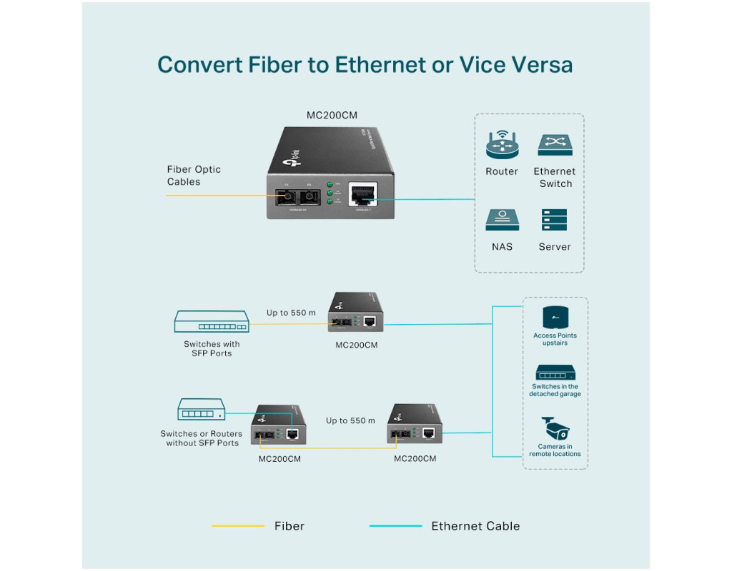 MC200CM - це медіаконвертер, що служить для перетворення сигналу і подальшого з'єднання оптоволоконного кабелю 1000BASE-SX з крученою парою 1000Base-T і навпаки. Розроблений спеціально під стандарти IEEE802.3ab 1000Base-T і IEEE802.3z 1000Base-SX, медіаконвертер MC200CM призначений для використання з багатомодовим оптоволоконним кабелем, що підключається по роз'єму SC. Під час передачі та отриманні даних конвертер працює на довжині хвилі 850 нм і відноситься до класу приладів, що використовують короткохвильовий лазер (SX) під час здійснення передачі з максимальною швидкістю. Серед інших функцій даного пристрою слід відзначити можливість використання медіаконвертера в якості незалежного виробу (для MC200CM не вимагається шасі для кріплення) або разом з 19'' спеціальним шасі TP-LINK з підтримкою Auto MDI/MDI-X для порту ТХ, а також оснащеного світлодіодними індикаторами стану. MC200CM дозволяє збільшити довжину оптоволоконного каналу на відстань до 0,55 км. |