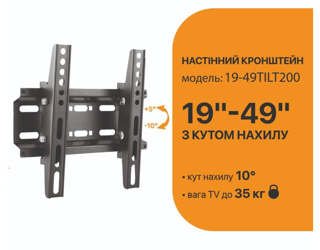 | Кронштейн SATELIT 19-49TILT200 забезпечує комфортний перегляд улюблених телеканалів завдяки своїй похилій конструкції із кутом нахилу. Після надійного закріплення ТВ на стіні, залишається можливість змінити кут нахилу до 10° по вертикалі.