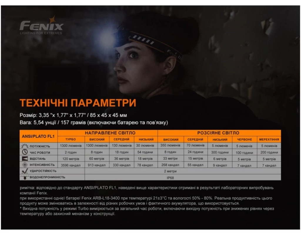 | Ліхтар налобний Fenix HM60R — це високотехнологічний пристрій для тих, хто цінує якість, надійність та інноваційність. Спеціально розроблений для активного відпочинку, туризму та спорту, цей ліхтар поєднує в собі передові технології та виняткову зручність використання. Оснащений літій-іонним акумулятором формату 18650, ліхтар забезпечує тривалу та стабільну роботу. Процес заряджання стає ще зручнішим завдяки інтерфейсу USB Type-C, що дозволяє швидко відновити енергію. Інтегрований індикатор низького заряду сповіщає про потребу в підзарядці, не дозволяючи втратити контроль над пристроєм у відповідальний момент. Однією з найяскравіших особливостей Fenix HM60R є технологія сенсора частоти кроку. Вона робить цей ліхтар ідеальним вибором для спортсменів: якщо частота кроків збільшується до 220 у хвилину, ліхтар автоматично підвищує яскравість до 150% від базової. Це дозволяє економити заряд акумулятора, оптимізуючи світловий потік залежно від швидкості руху. Fenix HM60R виготовлений з високоякісного магнієвого сплаву, алюмінію та пластику, що робить його легким (вагою лише 157 г) та надзвичайно стійким до зношування. Він витримує падіння з висоти до 2 метрів, що підтверджує його здатність витримувати суворі умови використання. Міцність конструкції доповнює клас захисту IP68, який забезпечує надійність навіть у несприятливих погодних умовах, дозволяючи використовувати ліхтар під водою та в запилених середовищах. Вісім режимів роботи, серед яких турбо, максимальний, середній та унікальний режим SOS, роблять використання ліхтаря максимально адаптивним під різні умови експлуатації. Їх легко налаштувати за допомогою простої одноразової кнопки, що робить Fenix HM60R зручним у використанні навіть під час руху. Функція запам’ятовування режимів підвищує зручність, автоматично відновлюючи попередньо використаний режим. Додаткові функції та переваги роблять цей ліхтар надзвичайно безпечним та надійним партнером у будь-якій подорожі. Ущільнювальне кільце забезпечує ідеальну герметичність, а система захисту від перегрівання запобігає будь-яким негараздам при активній роботі на максимальній потужності. Функціональність Fenix HM60R вражає, а його компактність (довжина лише 85 мм) та зручність у використанні роблять його ідеальним аксесуаром для голови, який не викликає дискомфорту навіть при тривалому носінні. Цей ліхтар — це не просто джерело світла, а надійний компаньйон для тих, хто шукає високу якість та інноваційні рішення у сфері освітлення. |