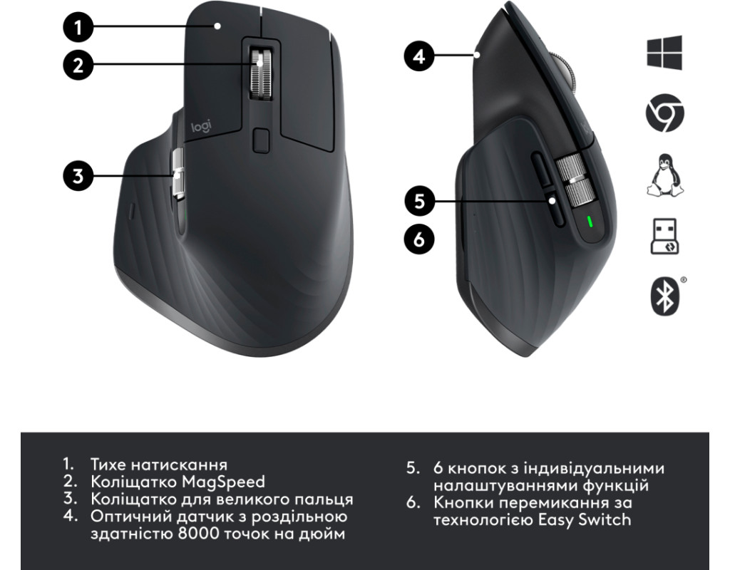 | Мишка Logitech MX Master 3S for Business — це поєднання інноваційного дизайну та відмінної продуктивності, створена для того, щоб задовольнити потреби професіоналів, що працюють в умовах мобільності та швидко змінюваного середовища. Завдяки своєму оригінальному дизайну, вона не лише виглядає стильно, але й забезпечує максимальний комфорт під час тривалої роботи. Бездротове підключення через USB адаптер 2,4 ГГц або через Bluetooth дозволяє забути про заплутані кабелі й насолоджуватися свободою пересування. MX Master 3S легко підключається до кількох пристроїв, надаючи користувачеві можливість безперешкодно переключатися між ними, що значно полегшує багатозадачність. Оснащена оптичним датчиком з роздільною здатністю до 4000 dpi, ця мишка забезпечує високу точність і плавність управління, що особливо важливо для дизайнерів, програмістів та всіх, хто цінує скрупульозність у роботі. Шість кнопок налаштовуються під індивідуальні потреби, забезпечуючи швидкий доступ до часто використовуваних функцій і команд. Ергономічний дизайн мишки розроблений таким чином, щоб зменшити навантаження на руку і запобігти втомі навіть при тривалому використанні. Вага всього 99 г і компактні розміри (124,9 х 84,3 х 51 мм) роблять її ідеальною для мобільної роботи з будь-якого місця — з дому, кафе або навіть в залі очікування аеропорту. Працює від акумулятора, який забезпечує довге автономне функціонування. Ви зможете зосередитись на важливих завданнях, не переймаючись потребою в частому заряджанні. А стильний графітовий колір доповнить ваш робочий простір, додаючи сучасності та елегантності. Logitech MX Master 3S — це не просто мишка, це ваш надійний партнер в досягненні нових професійних звершень. Забезпечте собі зручність і продуктивність, які ви заслуговуєте, обравши цю мишку для свого бізнесового арсеналу. |