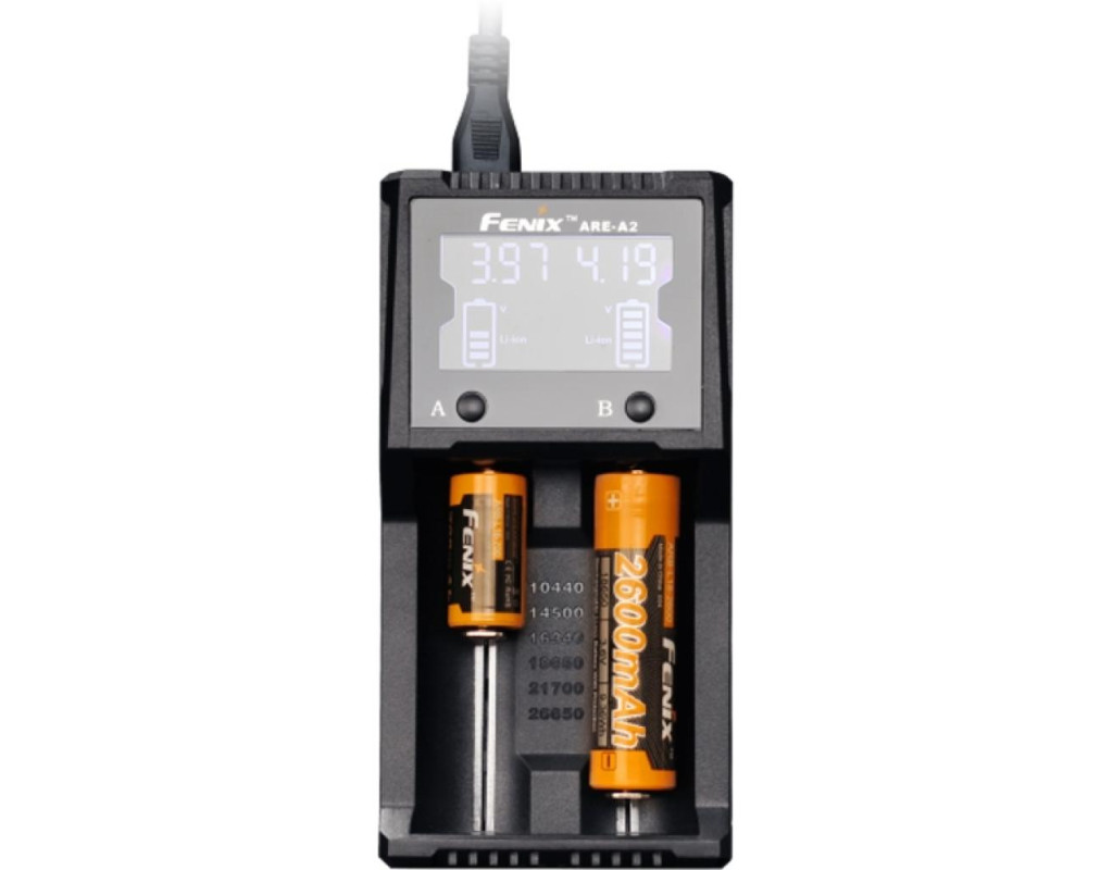 Для зарядки будь-яких акумуляторів набагато зручніше використовувати всього один пристрій, ніж кожен раз шукати підходящий варіант. Таким пристроєм може стати Fenix ARE-A2. Ця модель ефективно працює з самими різними за типом і розміром акумуляторами, включаючи популярні формати АА, ААА, 18650, 14500, 26650, С та інші. Це можуть бути літій-іонні акумулятори на 1,5 В або ж нікель-кадмієві, нікель-металгідридні елементи живлення. Причому, навіть батареї різного типу можна заряджати одночасно. Два каналу пристрою Fenix ARE-A2 зроблені абсолютно окремими, що дозволяє в автоматичному режимі підбирати оптимальну програму для кожного елемента живлення. Вся інформація щодо процесу зарядки виводиться на дисплей, розташований над слотами зарядки. Різні дані показуються на ньому по черзі, а перемикання відбувається за допомогою двох кнопок внизу: по одній для кожного каналу. Користувачеві доступна інформація про поточний стан зарядки, тип і напругу акумулятора, розрахунковий час зарядки. При бажанні, екран можна повністю відключити, для цього потрібно подовше потримати кнопку натиснутою. Використовувати Fenix ARE-A2 зручно в будь-якій ситуації вдома або в подорожі. У комплекті з цим зарядним пристроєм йде кабель до електромережі 220В, але додатково можна купити і провід до автомобільного акумулятора. Важливо, що в даній моделі дуже якісно зроблений захист від можливих поломок: внаслідок переполюсовки контактів і виникнення короткого замикання. Також виключено перегрівання і перезарядка акумуляторів будь-якого сумісного типу. Зарядний пристрій Fenix ARE-A2 важить 178 г, так що його не складно буде взяти з собою в будь-яку поїздку, щоб відновлювати працездатність акумуляторів до фотоапарата, GPS-пристрою та будь-якої іншої техніки. Відмінно працює при температурі навколишнього середовища від -20 ℃ до + 50 ℃. Допустимий діапазон вологості для цієї моделі становить 5-90%. Особливості: