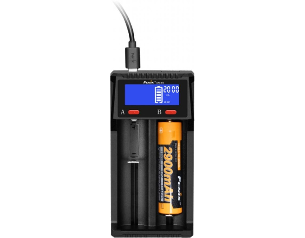 Зарядний пристрій Fenix ARE-D2 розроблено для використання з акумуляторами на основі нікелю і літію. Всього воно підтримує 9 форматів елементів живлення. Серед нікель-кадмієвих та нікель-металгідридних - пальчикові акумулятори (АА), мікропальчикові (ААА), С. Серед літій-іонних вибір ще ширше: 10440, 16340, 18650, 21700, 14500, 26650. В моделі Fenix ARE-D2 є 2 повністю незалежних слота, тому одночасно можна заряджати пару будь-яких акумуляторів. Спочатку слід встановити елементи живлення, а потім - підключити пристрій до мережі. Пристрій самостійно визначить тип акумуляторів і вибере для них відповідну програму зарядки. Але при бажанні, користувач може вручну вибрати потрібну силу струму заряду. Протягом 8 секунд після включення в мережу, поточне значення буде відображатися на дисплеї зарядного пристрою, а змінити його можна натисканням на кнопку під дисплеєм, з боку потрібного каналу. Для Li-ion акумуляторів є 3 опції: 0,5 А, 1А, 2А. Ni-Mh і Ni-Cd батареї підтримують 2 значення сили струму: 0,5 А і 1А. На вбудований дисплей виводиться і інша інформація про характеристики акумулятора, процес його зарядки. Після короткого натискання на кнопку, в циклічному порядку показуються такі дані: сила струму, напруга, ємність елемента живлення, час заряду. Підключення Fenix ARE-D2 відбувається через кабель мікро-USB. Також можна використовувати адаптер під USB. Крім традиційних джерел енергії, ця модель зарядного пристрою також підключається до туристичної сонячної панелі, а тому може використовуватися навіть в польових умовах. Однією з цінних функцій Fenix ARE-D2 є можливість його використання в ролі джерела енергії для інших пристроїв. Вона працює тільки з елементами живлення Li-ion типу. Таким чином можна підзарядити смартфон, планшет, смарт-годинник або інші гаджети. Функція зарядки акумулятора на цей час блокується. У пристрій Fenix ARE-D2 вбудований досить точний індикатор заряду. Він складається з 5 лампочок. Якщо горять всі з них, то акумулятор повністю заряджений. Якщо світяться 4 лампочки і ще 1 блимає, то рівень заряду знаходиться в діапазоні 81% -100%. Якщо горять тільки 3 лампочки і 1 блимає, то рівень заряду оцінений на 61% -80%. Коли заряду в акумуляторі на 41% -60%, світяться 2 лампочки, а 1 блимає. Якщо в акумуляторі 21% -40% енергії, то світиться 1 лампочка, а друга блимає. Якщо ж тільки 1 лампочка блимає, то енергії в акумуляторі не більше 20%. Модель Fenix ARE-D2 працює при температурі навколо від -20 ℃ до + 50 ℃. Діапазон вологості становить 5-90%. У цих умовах воно не повинно нагріватися під час роботи більше, ніж до 55 ℃. Вага цієї моделі складає 92 г, якщо не враховувати кабель. Довжина корпусу зарядного пристрою - 130 мм, ширина - 62 мм, висота - 30 мм. Особливості: