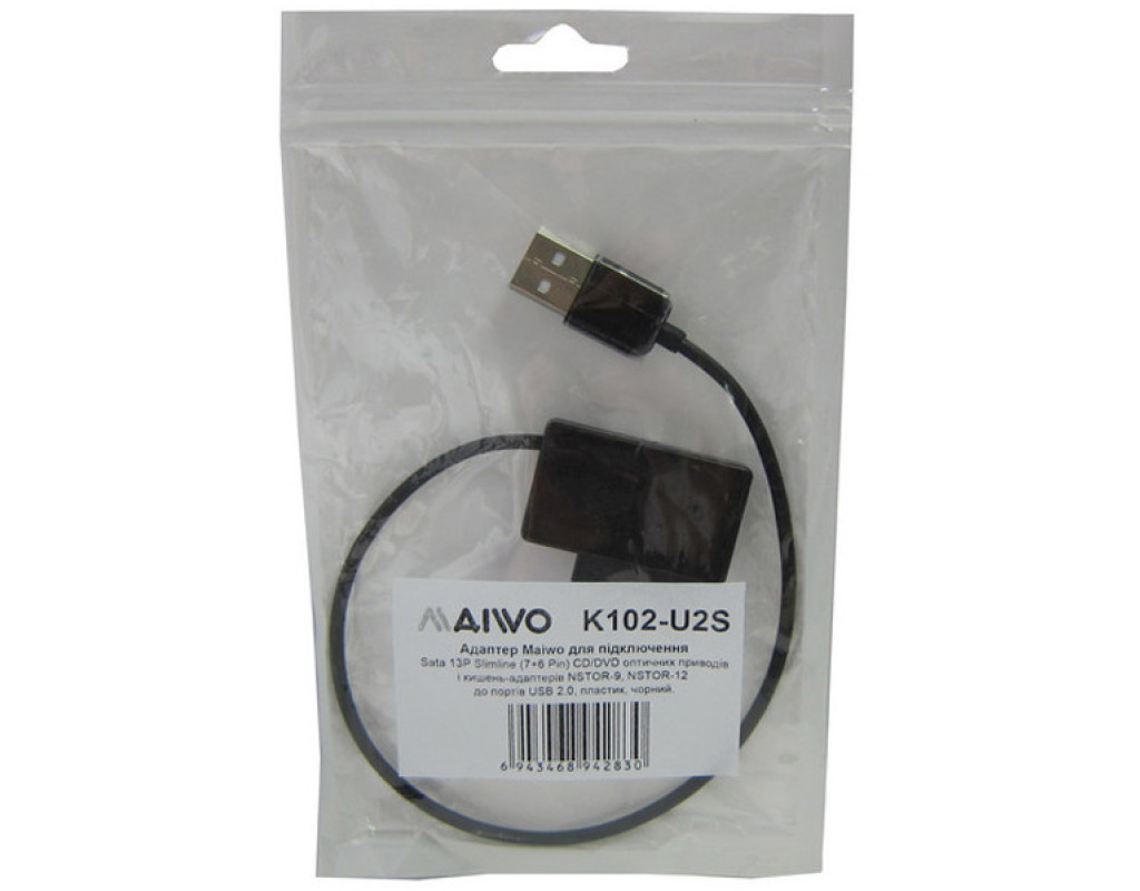 Адаптер з кабелем Maiwo K102-U2S призначений для підключення CD-ROM/DVD-приводів, а також кишень-адаптерів NSTOR-12/NSTOR-9/NSTOR-Macbook з інтерфейсом SlimLine SATA 13 pin (7+6 pin) до порту USB 2.0 комп'ютера або ноутбука.